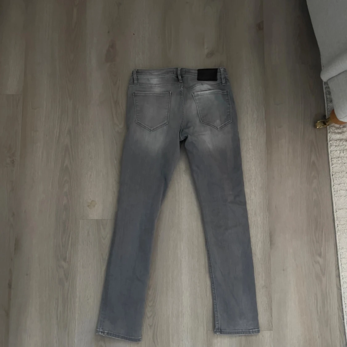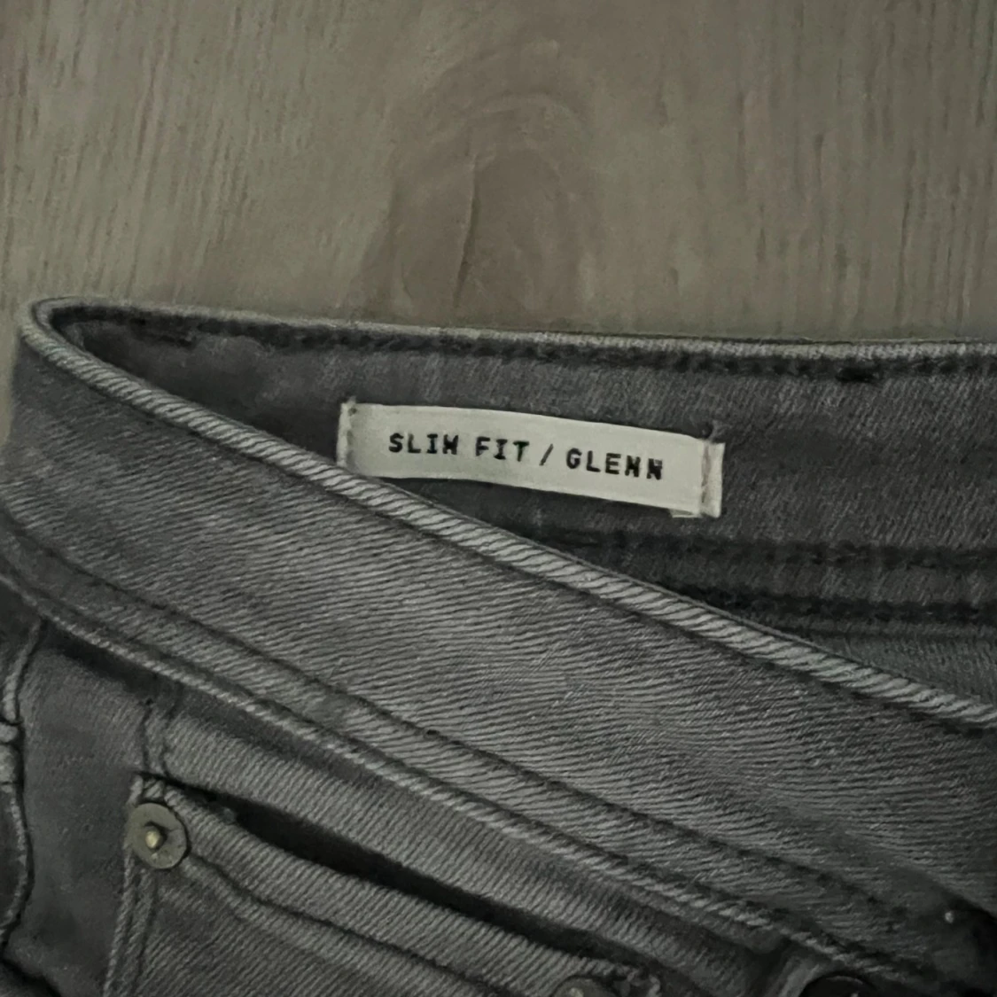 Snygga grå slim fit jeans från Glenn i storlek 30/32. Jeansen har klassisk femficksdesign, raka ben och en tvättad look med ljusare partier. Perfekta för dig som gillar en stilren och modern vibe.