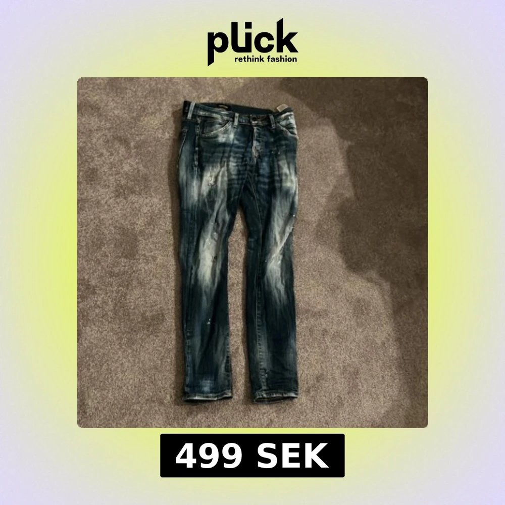 Säljer ett par blå jeans från Jack & Jones med coolt slitna detaljer och ljusa tvättade partier. Jeansen har raka ben, klassiska fickor och tydliga sömmar. Perfekt för dig som gillar en avslappnad streetstil. 30-32 size som sitter slimfit med slitningar
