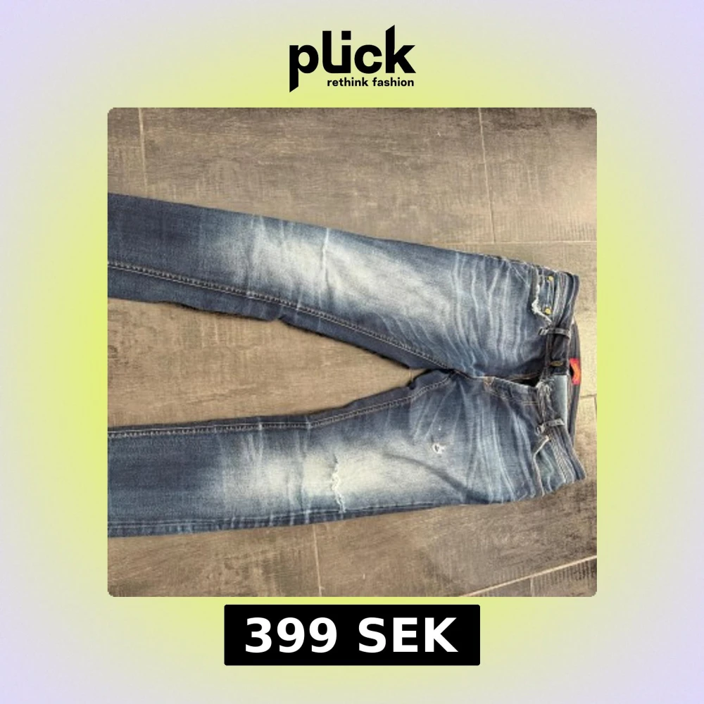 Snygga blå skinny jeans med en sliten look och ljusa tvättade detaljer. Perfekta för en trendig stil. De har klassiska fem fickor och knappgylf.