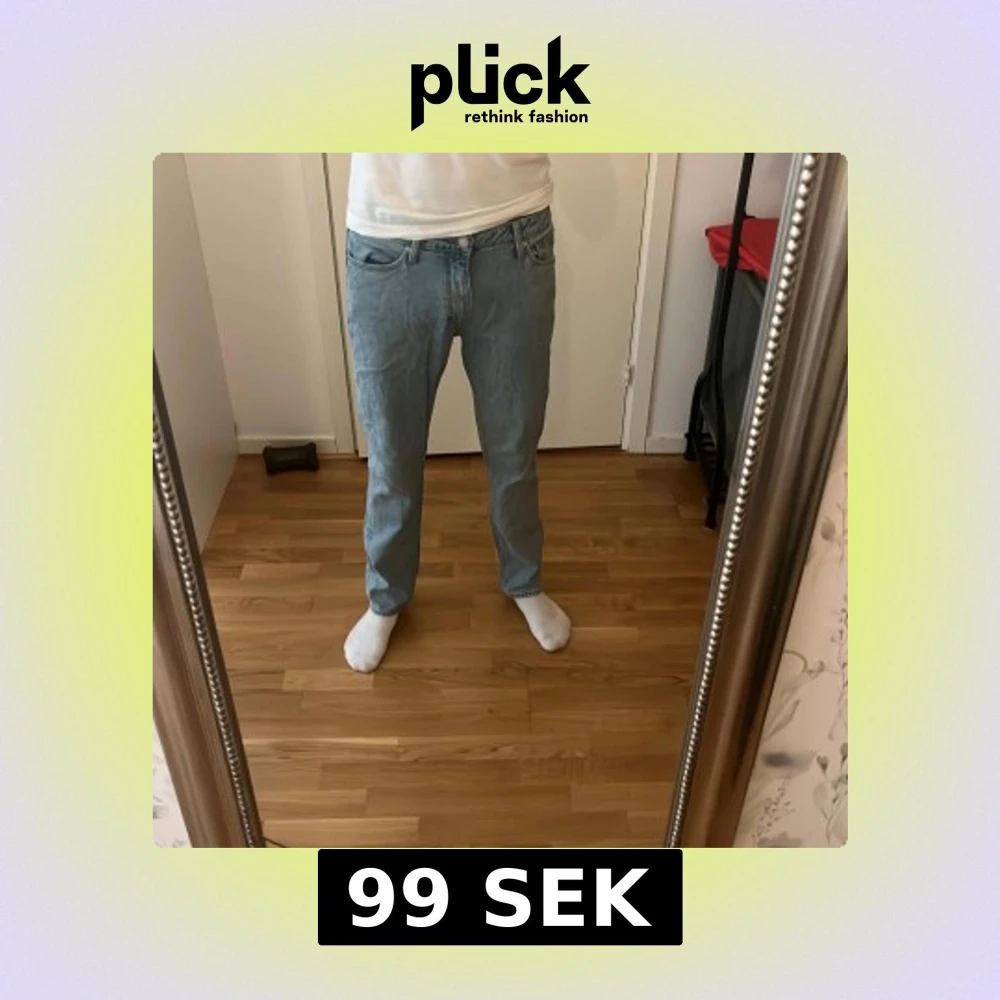 Säljer ett par ljusblå jeans med klassisk femficksdesign och rak passform. Jeansen har normal midja och är tillverkade i mjukt denimtyg. Perfekta för dig som gillar en enkel och clean look. Snygga att matcha med sneakers eller boots. Har en liten fläck färg på 4 bilden. Storlek 30-32
