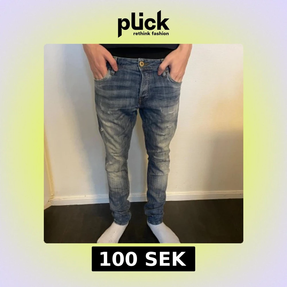 Snygga blå jeans med en cool slitningseffekt. De har en klassisk femficksdesign och en knappgylf. Perfekta för en avslappnad stil.