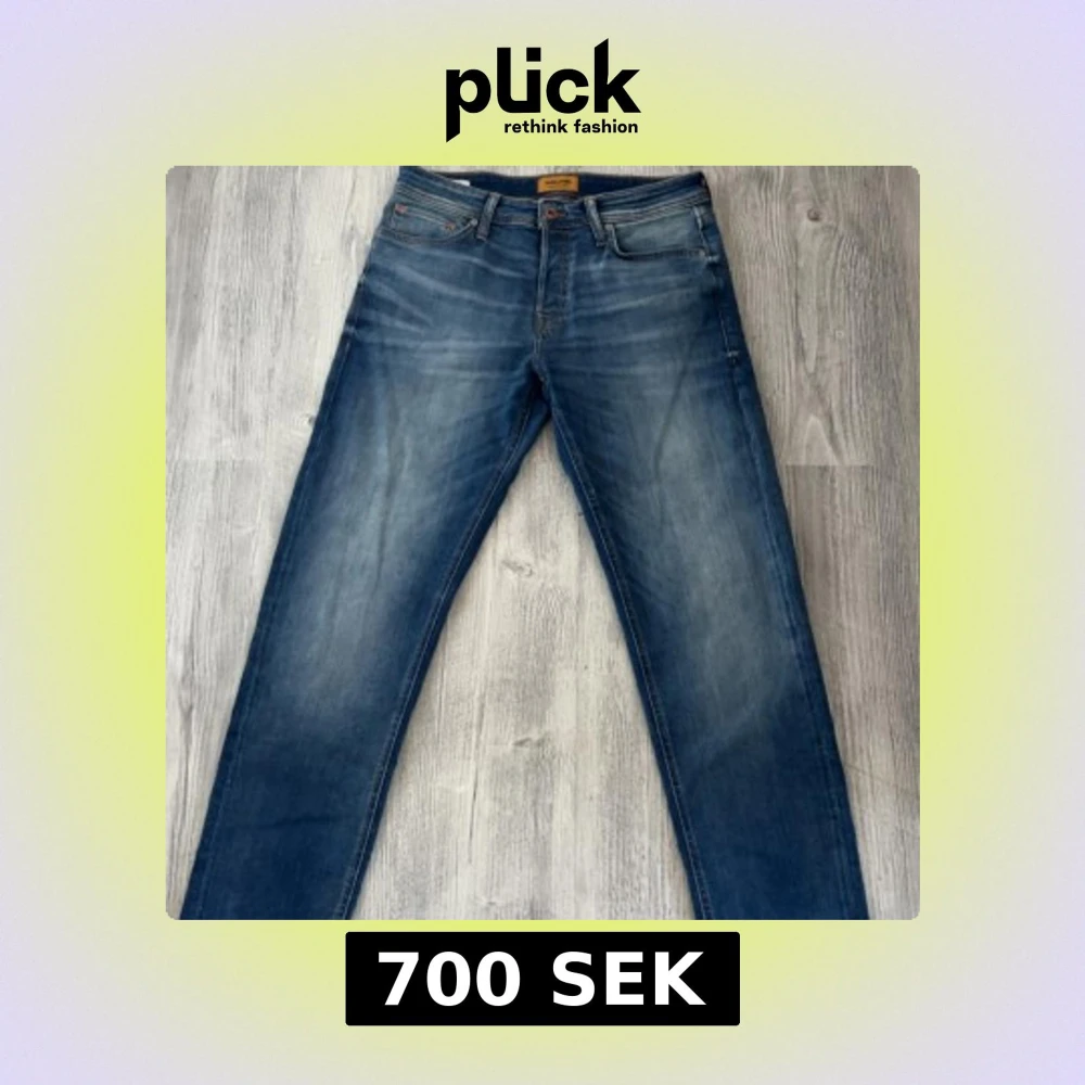 Snygga blå jeans från Jack & Jones med klassisk femficksdesign och diskreta slitningar framtill. Jeansen har raka ben och normal passform, perfekt till vardags. Tidlös modell med bruna sömmar och knappgylf. Helt oanvända endast provade. Nypris är 900kr men säljer de för 700kr! Skriv för frågor! Storleken är 31/32