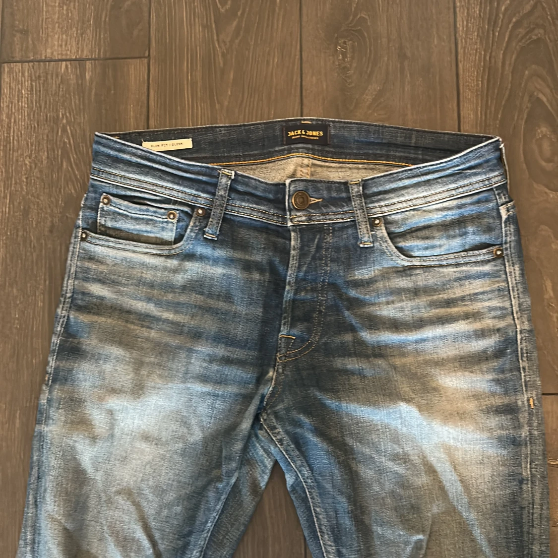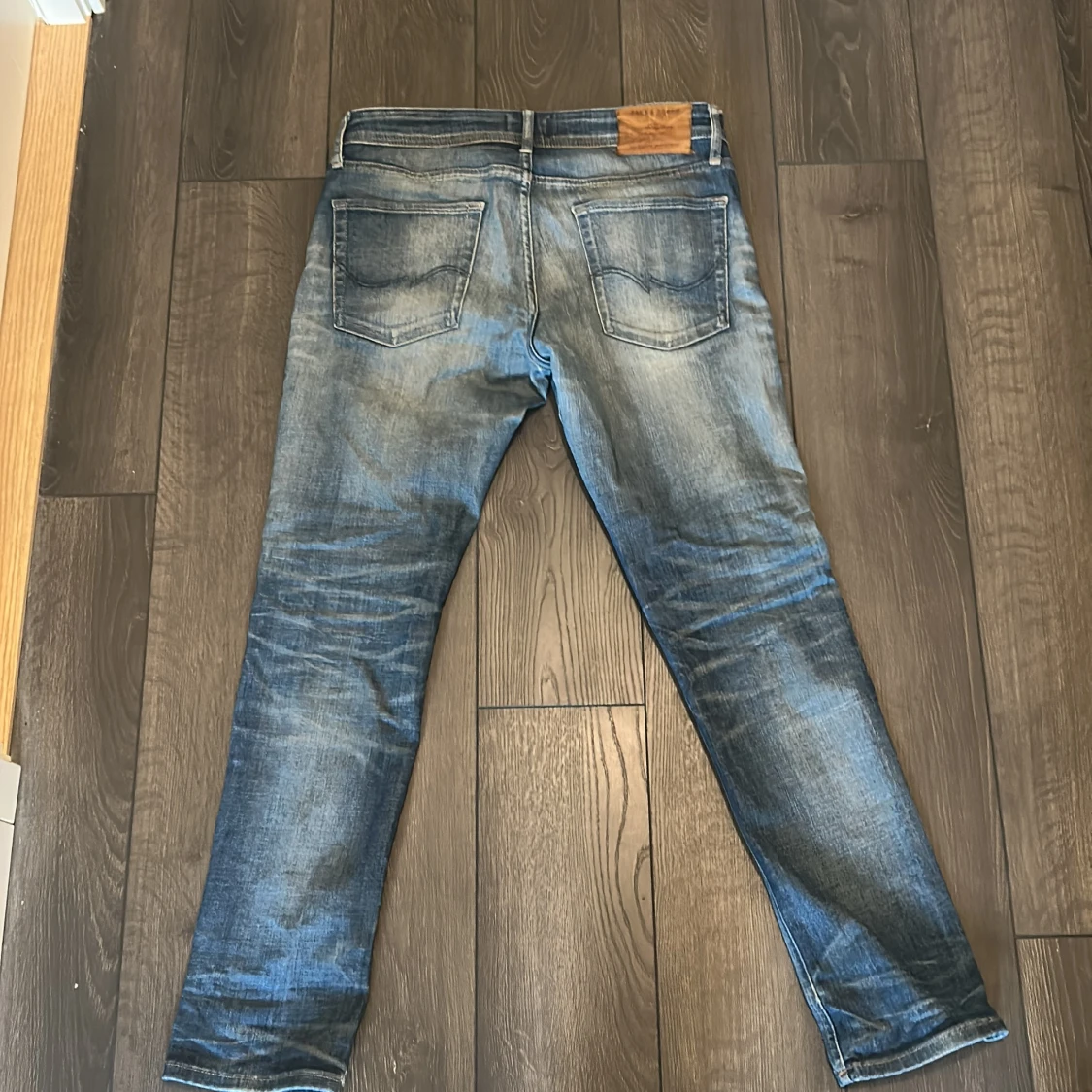 Snygga blå jeans från Jack & Jones med slitna detaljer och klassisk femficksdesign. Jeansen har normal passform och raka ben, med en cool tvättad look och läderpatch bak i midjan. Perfekta för en avslappnad stil.