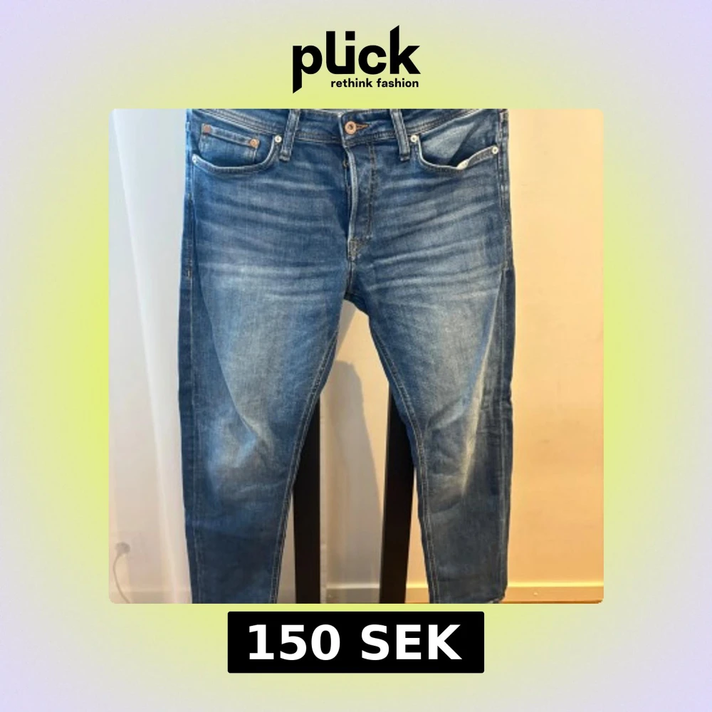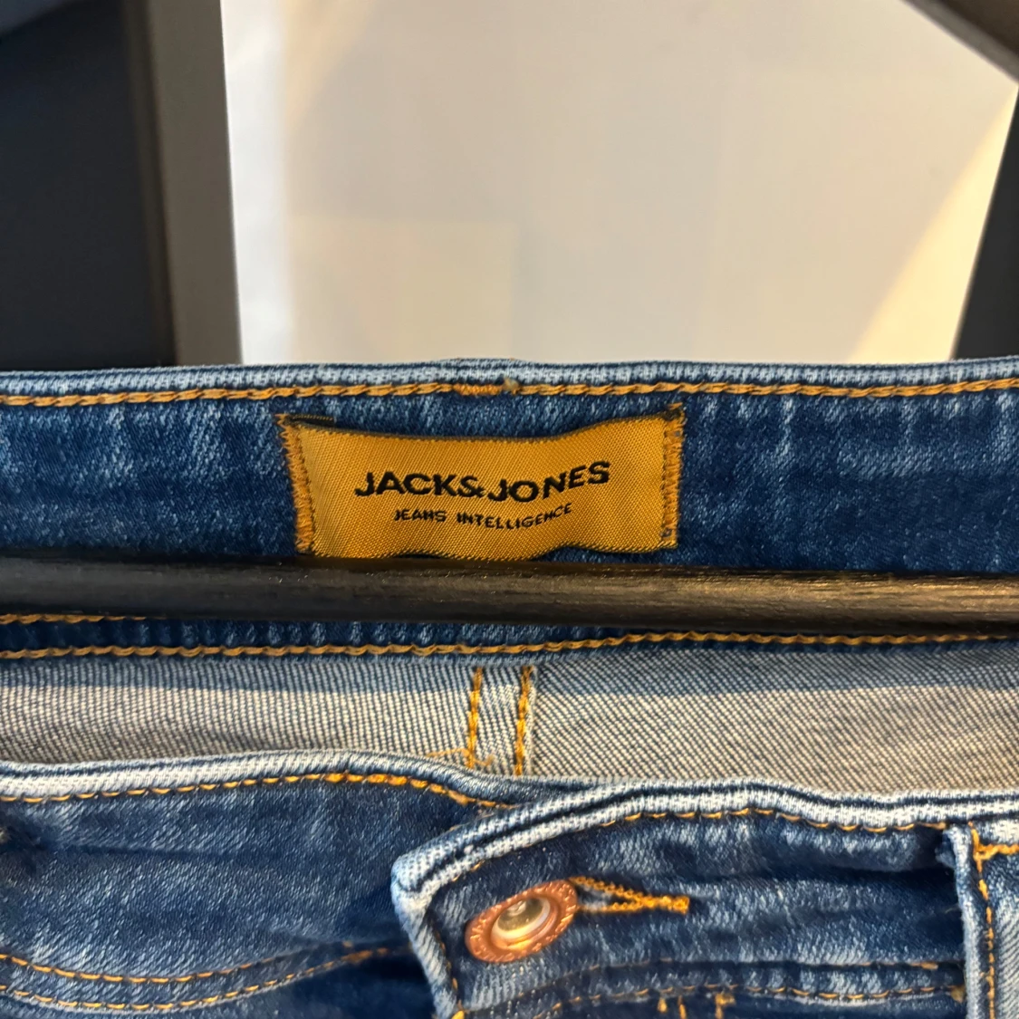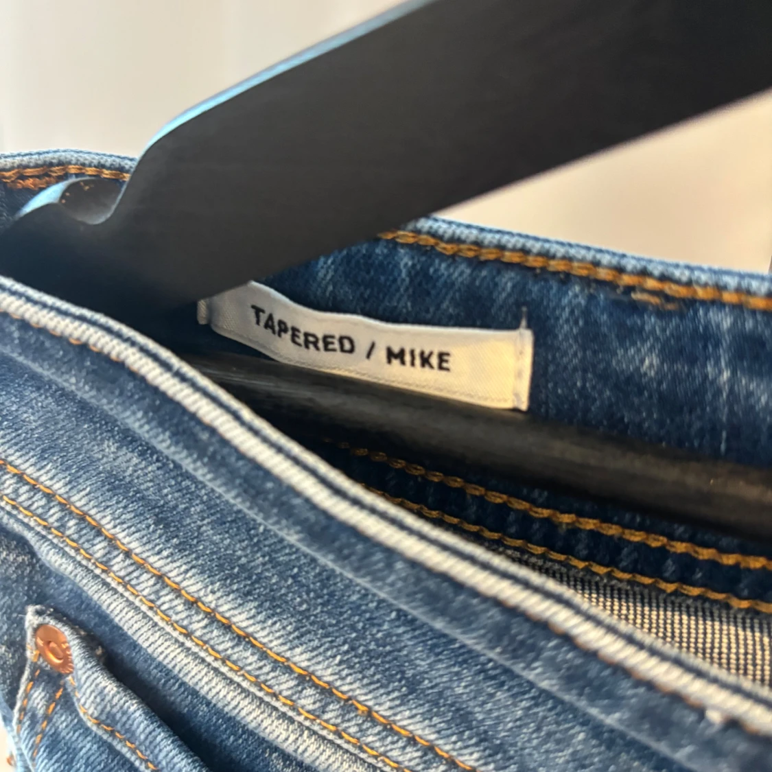 Säljer ett par klassiska blå jeans från Jack & Jones, modell Tapered Mike. Jeansen har normal passform upptill och smalnar av nedtill för en modern look. De har fem fickor, dragkedja och knapp i midjan.