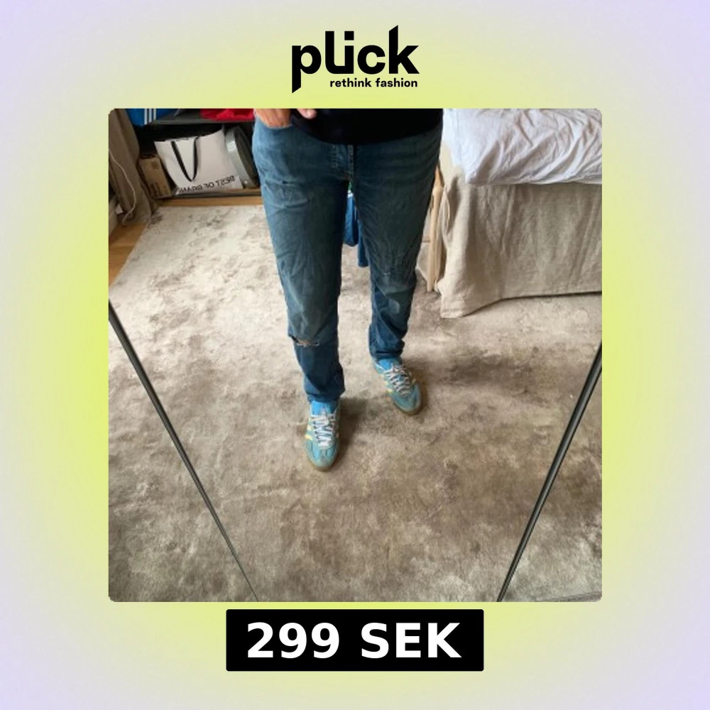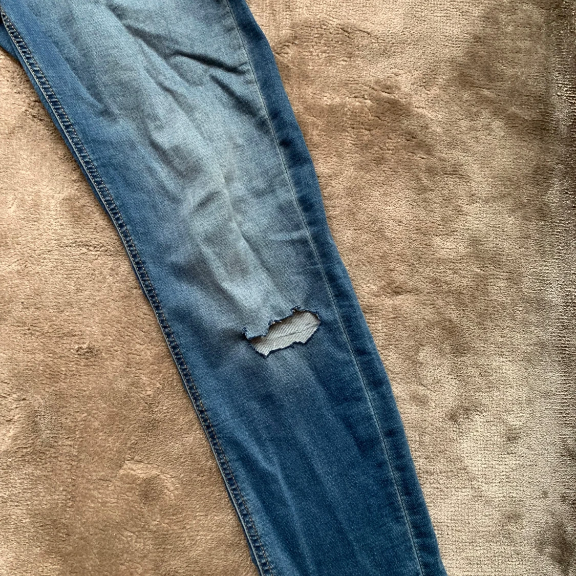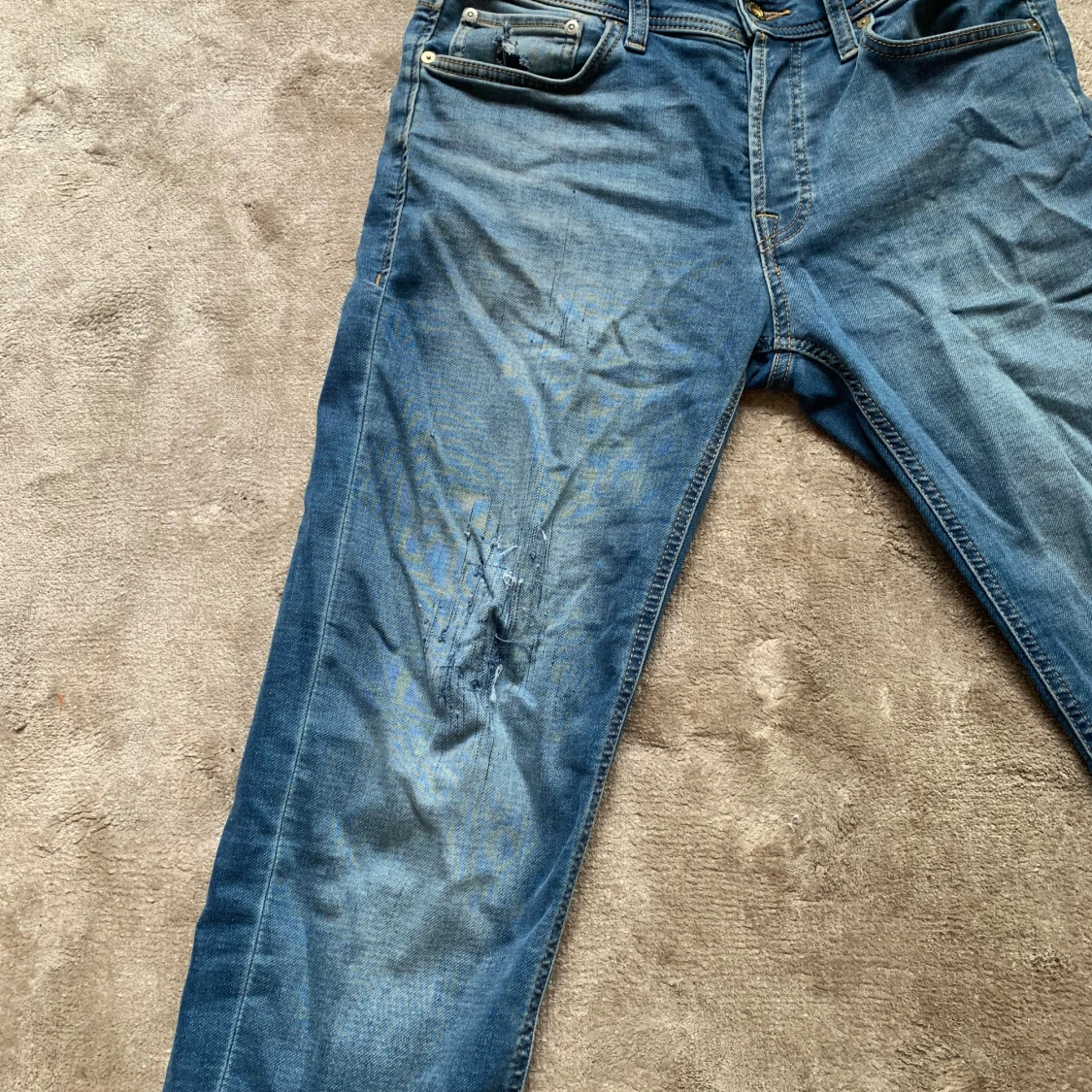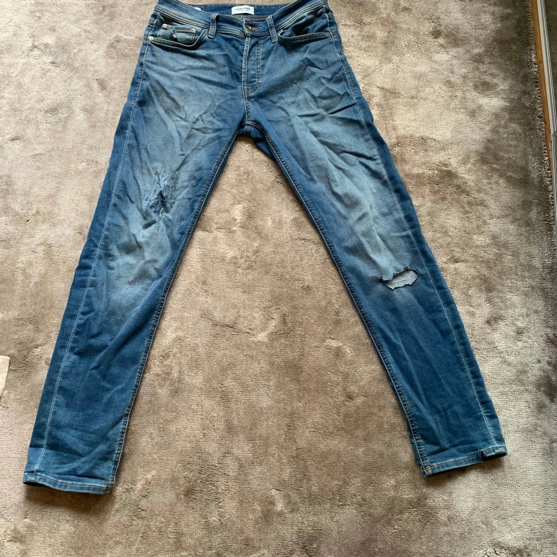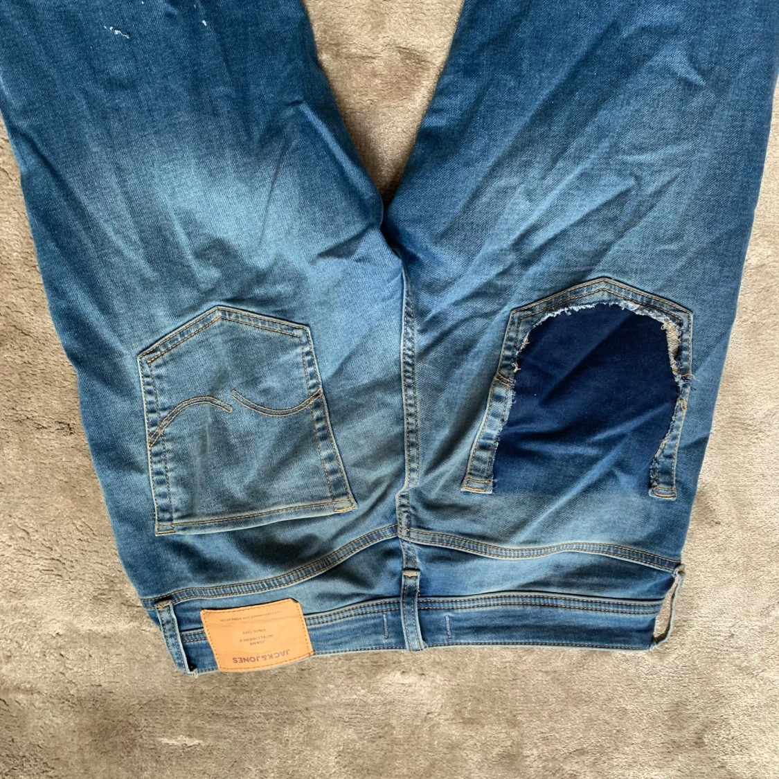 Säljer ett par blå jeans från Jack & Jones med klassisk femficksdesign. Jeansen har slitningar och hål på benen samt en patchad bakficka. De är raka i modellen och har en snygg tvättad look som ger en avslappnad vibe.