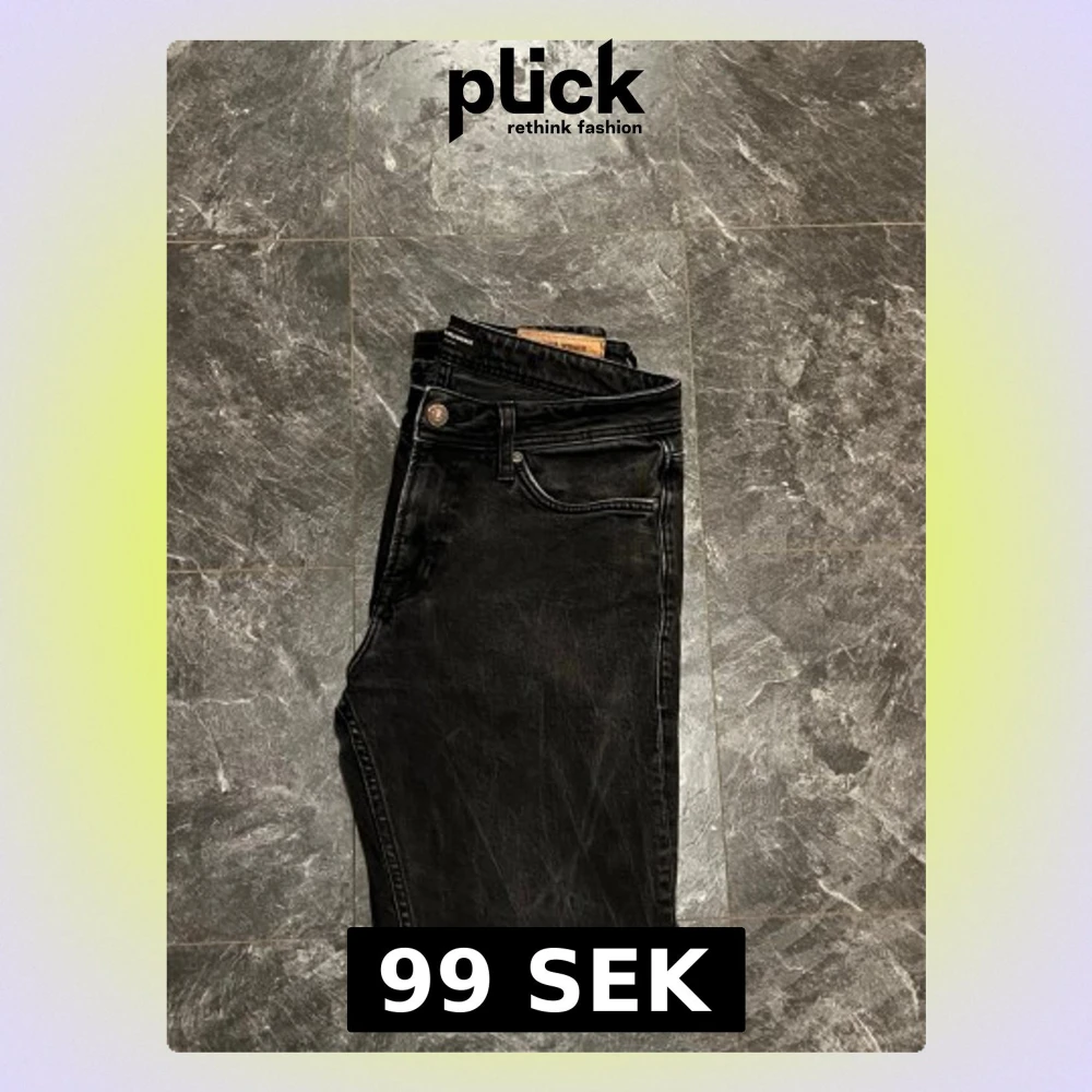 Säljer ett par svarta jeans från Jack & Jones med klassisk femficksdesign och snyggt läderpatch bak. Jeansen har rak passform och normal midja, tillverkade i slitstarkt bomullsmaterial. Perfekt för dig som gillar stilrena och enkla jeans.