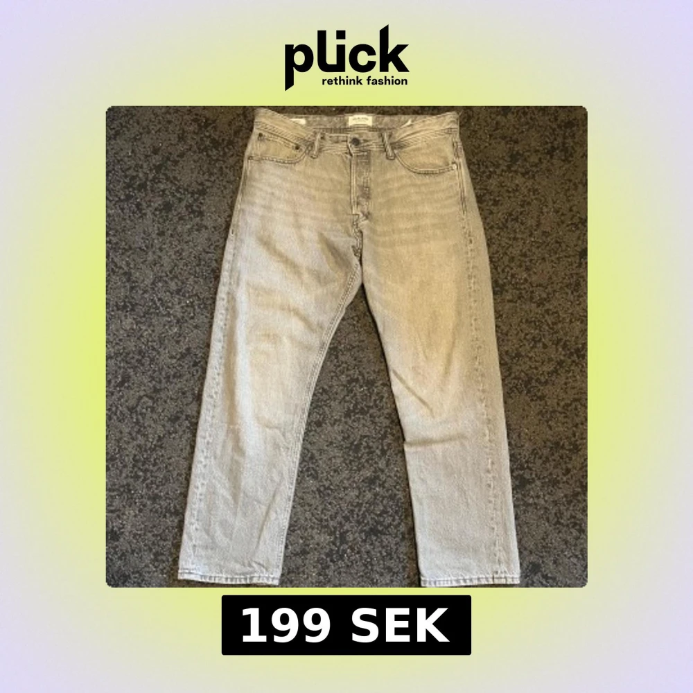 Säljer ett par grå jeans från Jack & Jones i modellen Loose/Chris. De har en regular passform och klassisk femficksdesign med knappgylf. Perfekta för en avslappnad stil. Storlek 32/30