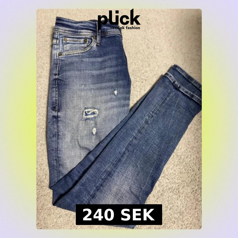 Snygga blå jeans från Jack & Jones med slitningar och lagad detalj på låret. Klassisk femficksmodell med ljus tvätt och kontrastsömmar. Jeansen har rak passform och är tillverkade i mjukt denimtyg för en bekväm känsla.