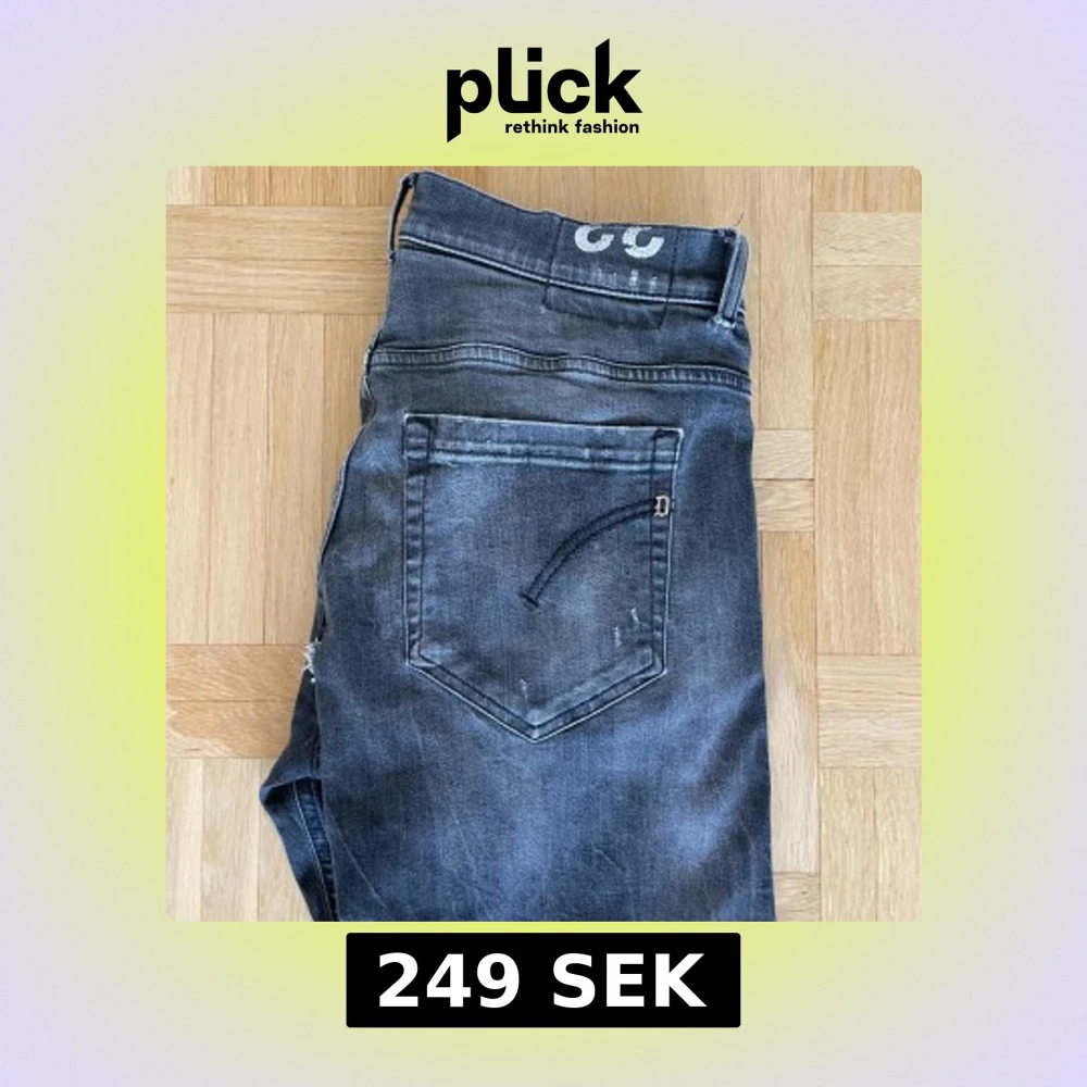 Säljer dessa fräsha svart/gråa jeans från Dondup med snyggt slitage på benen. Säljer pga hål vid skrevet, hålet är inte öppet och går förmodligen att lappa ihop. Pris kan diskuteras!