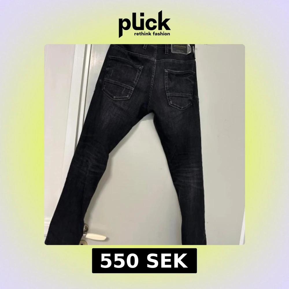 Säljer ett par svarta jeans från Jack & Jones med slitna detaljer och raka ben. Jeansen har fem fickor och klassisk knappgylf. Perfekta för en avslappnad stil.