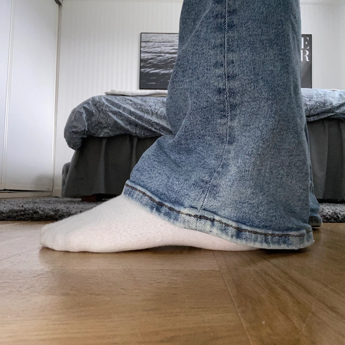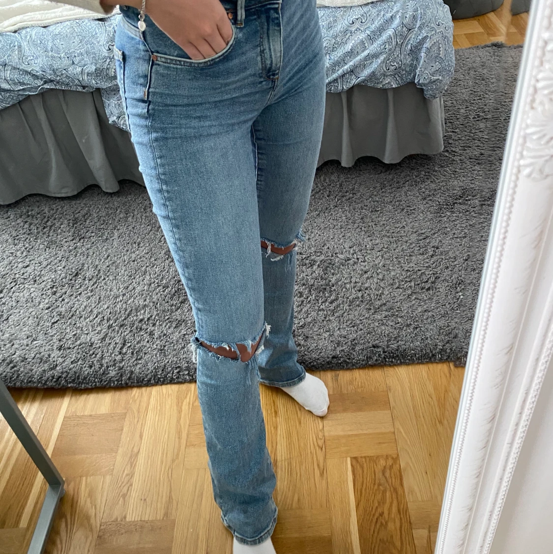 Blåa jeans från bikbok! Hålen har jag gjort själv💙 Använda, men i super bra skick!