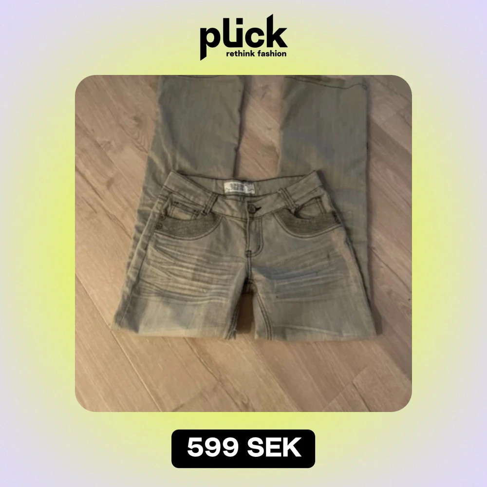 Skit snygga lågmidjade jeans med glittriga detaljer på. Jeansen är bootcut. Midjemått - 36 cm Innerbendlängd - 81 cm Ytterbenslängd- 104 cm Säljer då de tyvärr var för små. Pris kan diskuteras