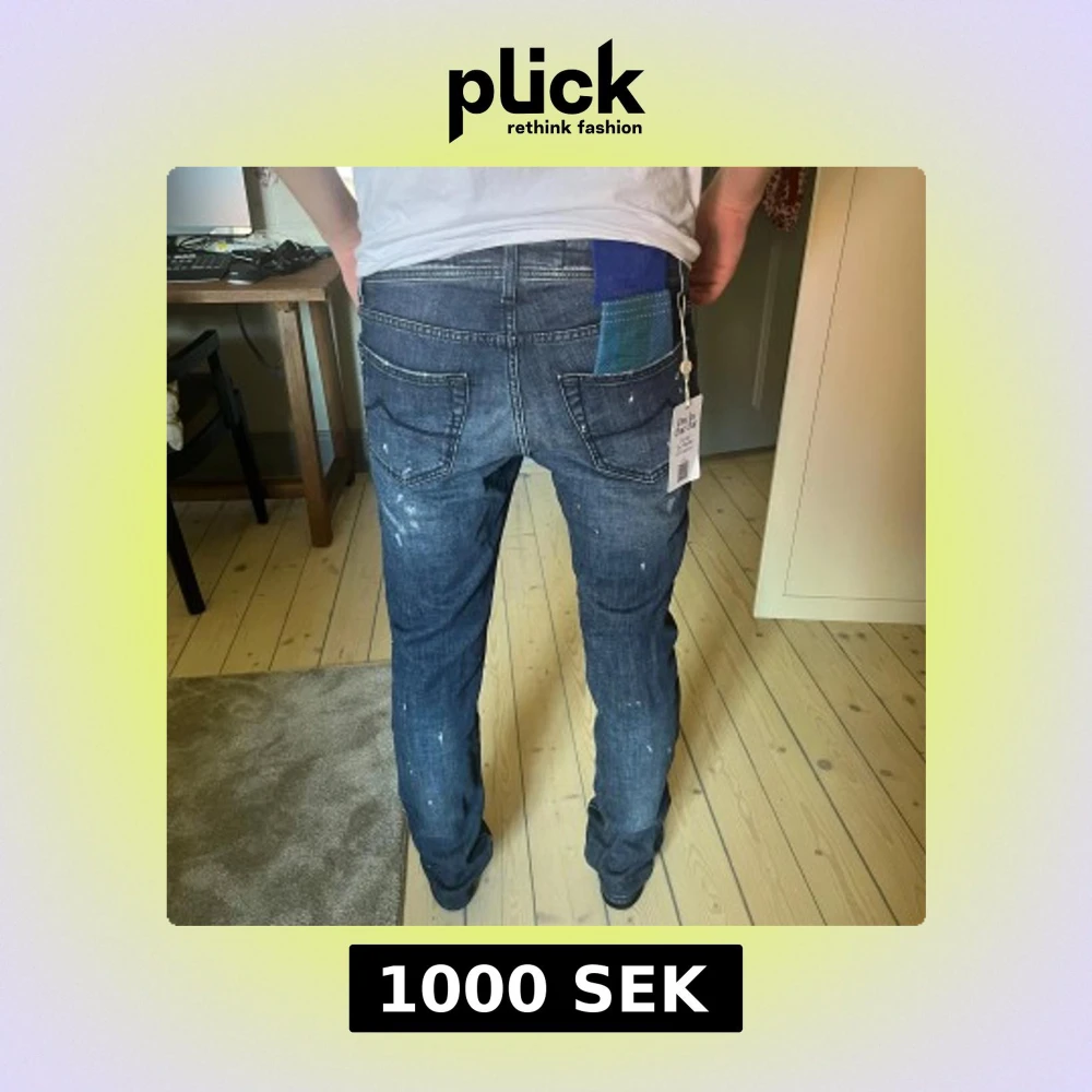 Säljer ett par Jacob Cohen jeans då de var för små för mig. Jeansen har en slim passform, raka ben och slitningar samt färgstänk på både fram- och baksida. Köpta från Vestiarie och äkthetsbevis finns!