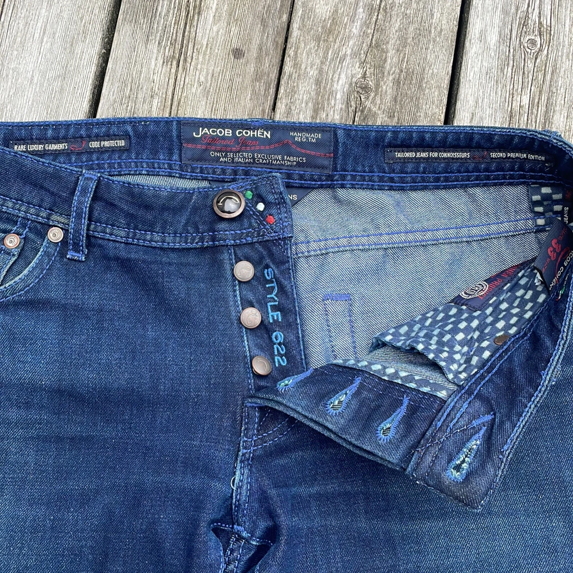 Snygga blå jeans från Jacob Cohen med klassisk femficksdesign och coola blå sömmar. Jeansen har knappar i metall och unika detaljer på insidan, samt en patch med logga bak. Handgjorda i Italien och tillverkade i mjukt jeansmaterial. Längd 104 bredd 42! Modellen är Bard 622! Notera att den aldrig blivit tvättade!