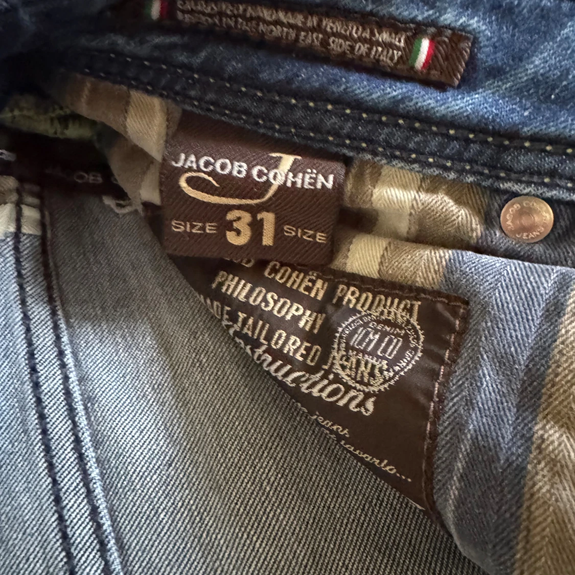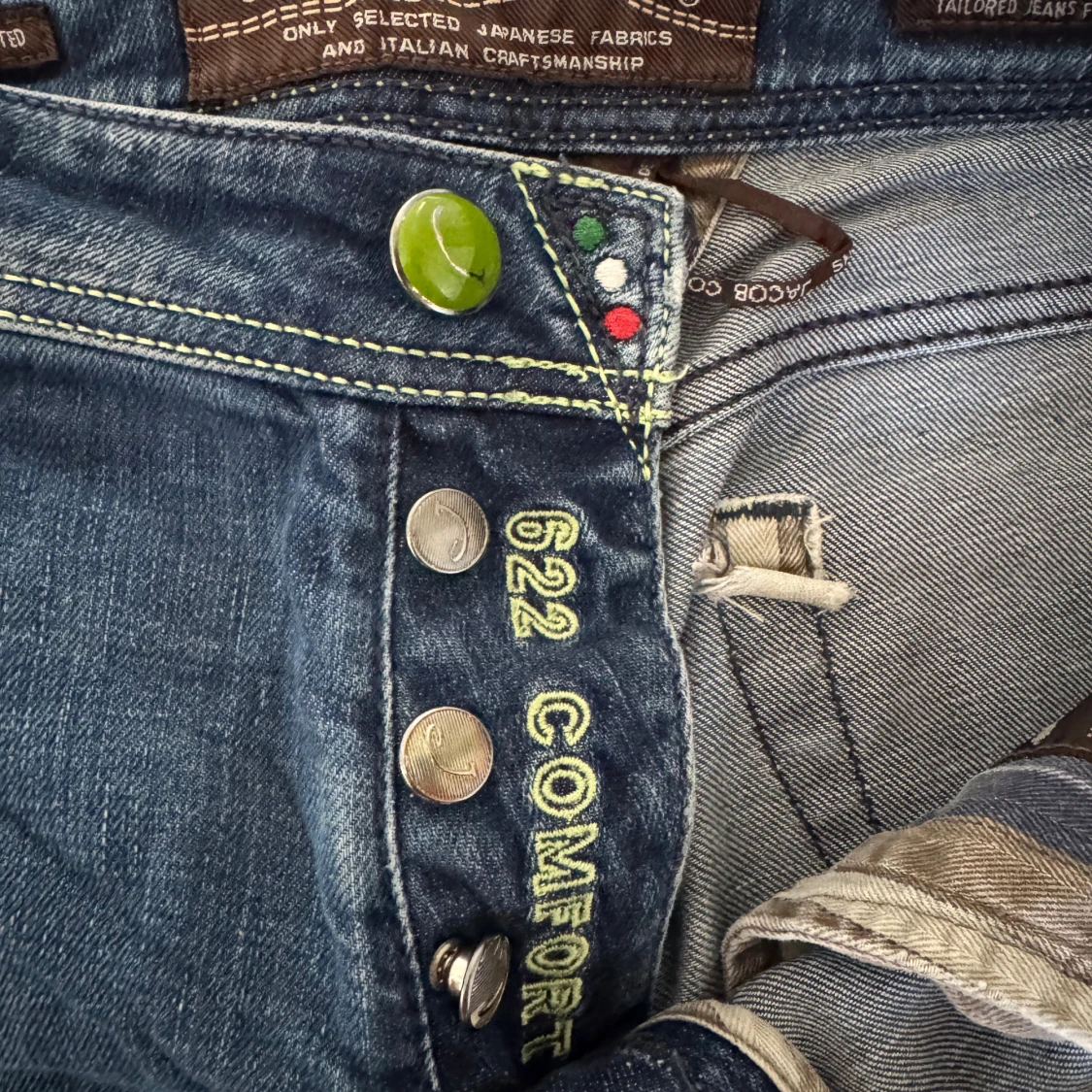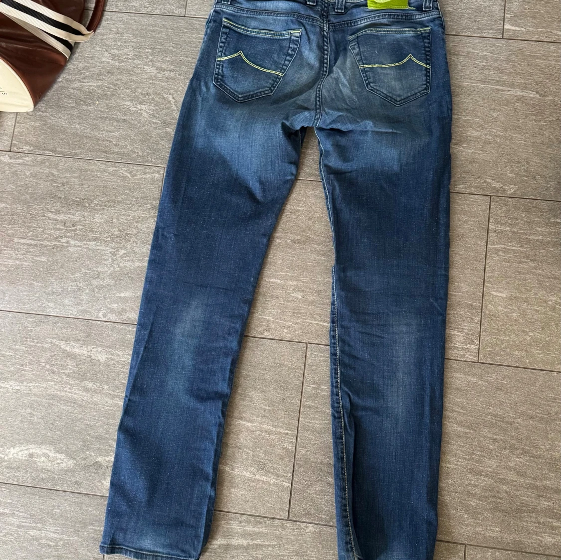 Snygga Jacob Cohen 622 Comfort jeans i mörkblå tvätt med coola slitningar och kontraststickningar. Klassisk femficksmodell med gröna detaljer och knappgylf. Slim passform och stretchigt jeanstyg för extra komfort. Perfekt för dig som gillar stilrena och trendiga jeans. Har en lagning i skrevet men den syns inte. Midjebredd 40,5cm, ytterbensmått 105cm. Hör av dig vid minsta fråga eller fundering!