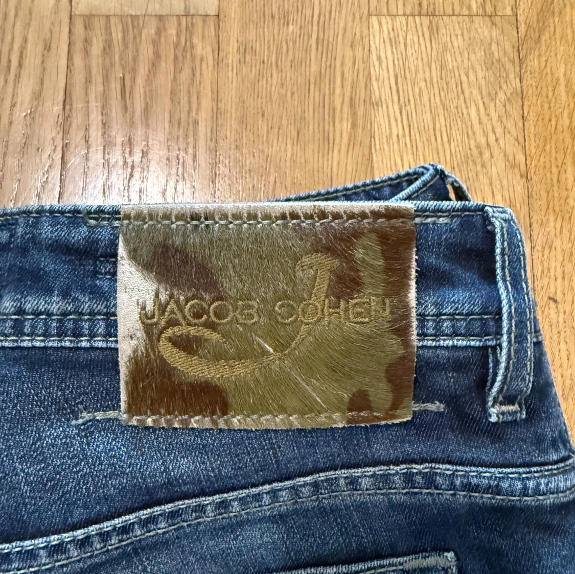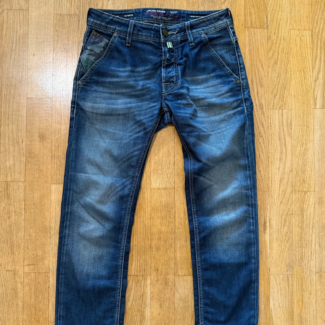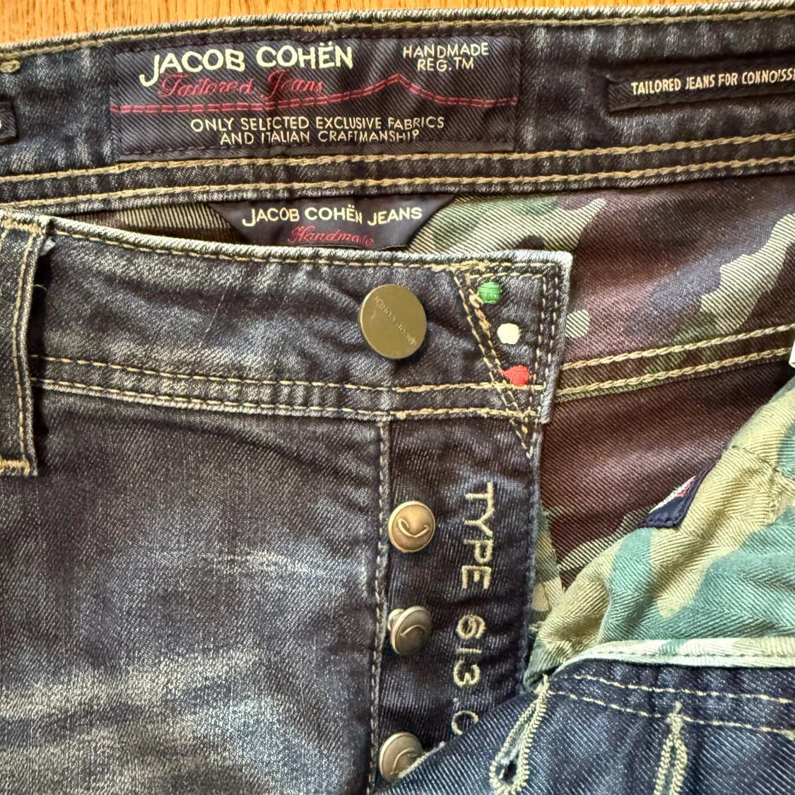 Snygga blå jeans från Jacob Cohën, modell 613, med coola camo-detaljer på fickor och insida. Jeansen har klassisk femficksdesign, kontrastsömmar och patch i pälsimitation bak. Tillverkade i mjukt denim med lätt tvättad look och raka ben.
