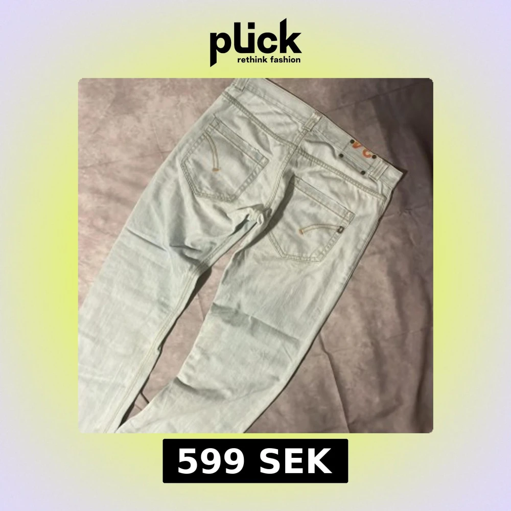 Säljer ett par ljusblåa jeans från Dondup, modell Stan Dart. Jeansen har klassisk femficksdesign, kontrastsömmar i gult och en snygg detalj på bakfickan. De är raka i modellen och är storlek 34. Skick 9/10 Inga konstigheter. Ny pris 3000, mitt pris 599