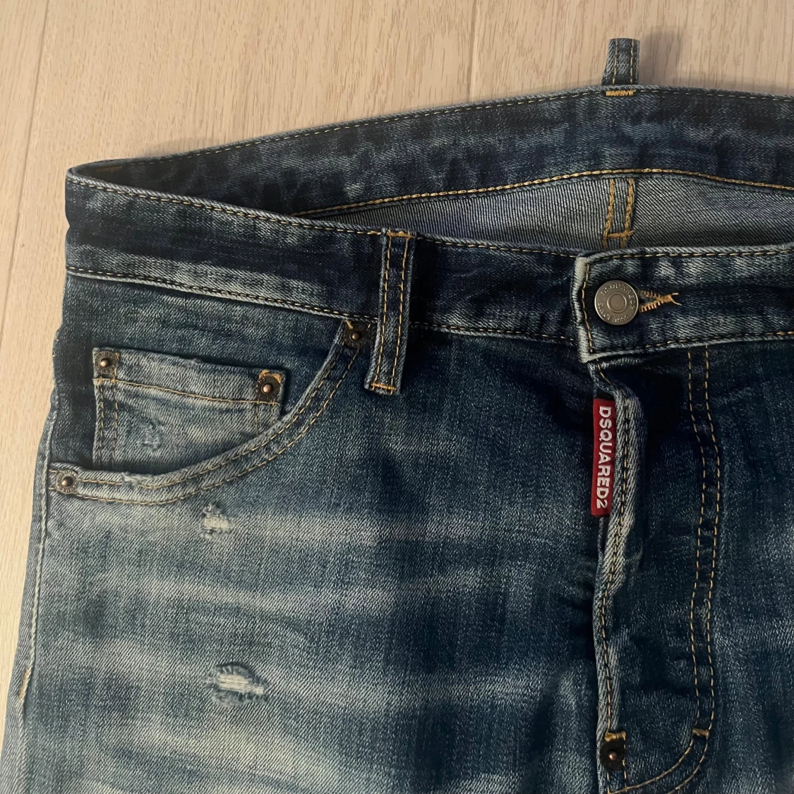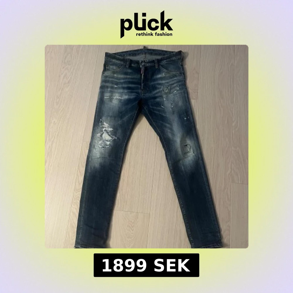 Snygga blå jeans från Dsquared2 model (cool Guy)med slitna detaljer och patch på bakfickan.Jeansen har coola slitningar och tvättade partier som ger en trendig look. Jeansen är köpta på United fashion i Göteborg Storlek 48 motsvarar 31 i midja