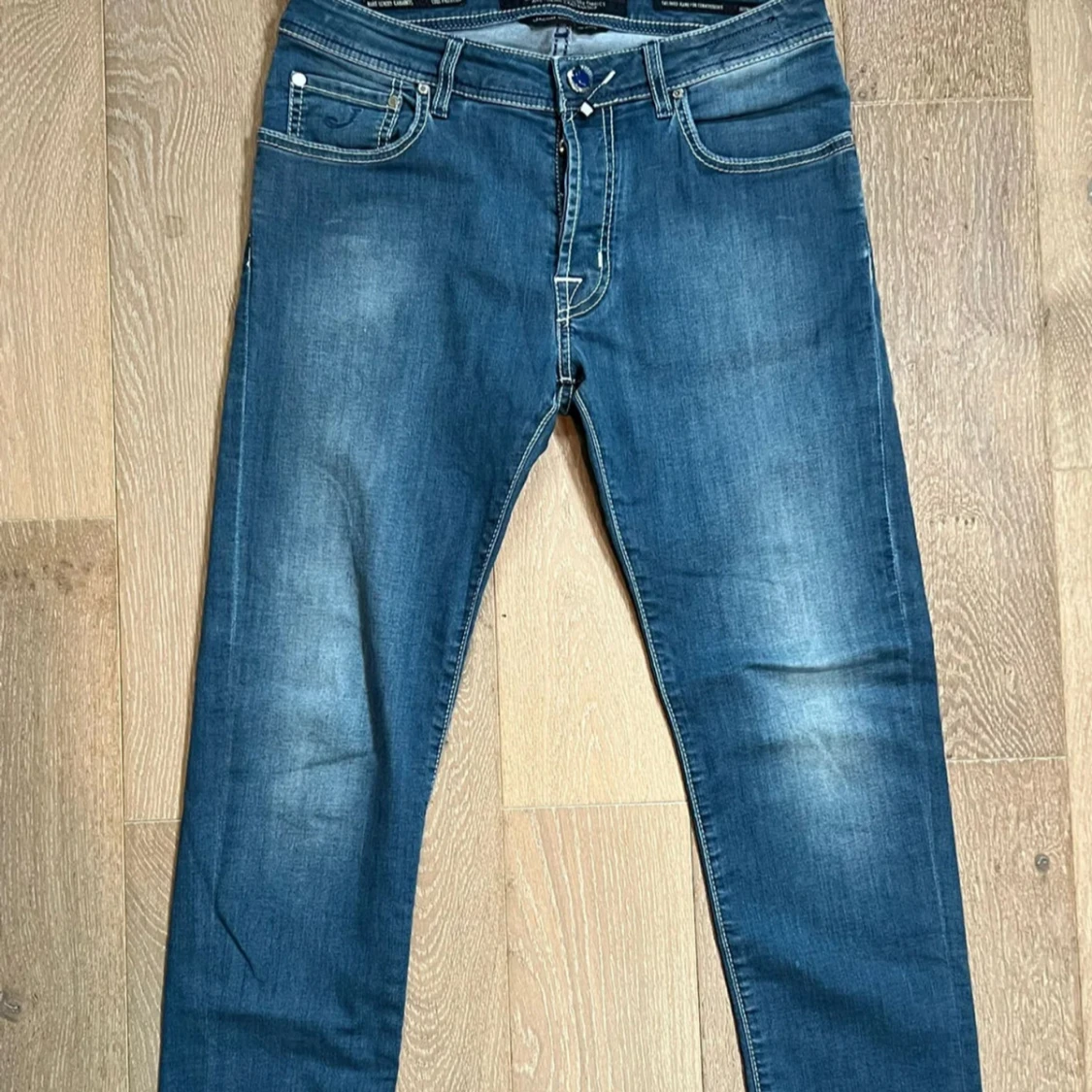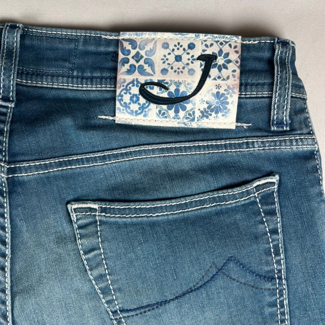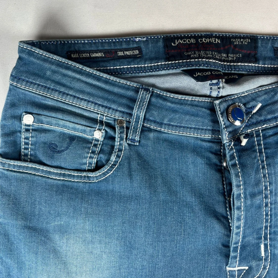 Snygga blå jeans från Jacob Cohen med klassisk femficksdesign och kontrastsömmar. Jeansen har en unik patch med blått mönster och J-logga bak i midjan. Materialet är mjukt denim och passformen är rak med normal midja. Perfekta för en avslappnad och stilren look.