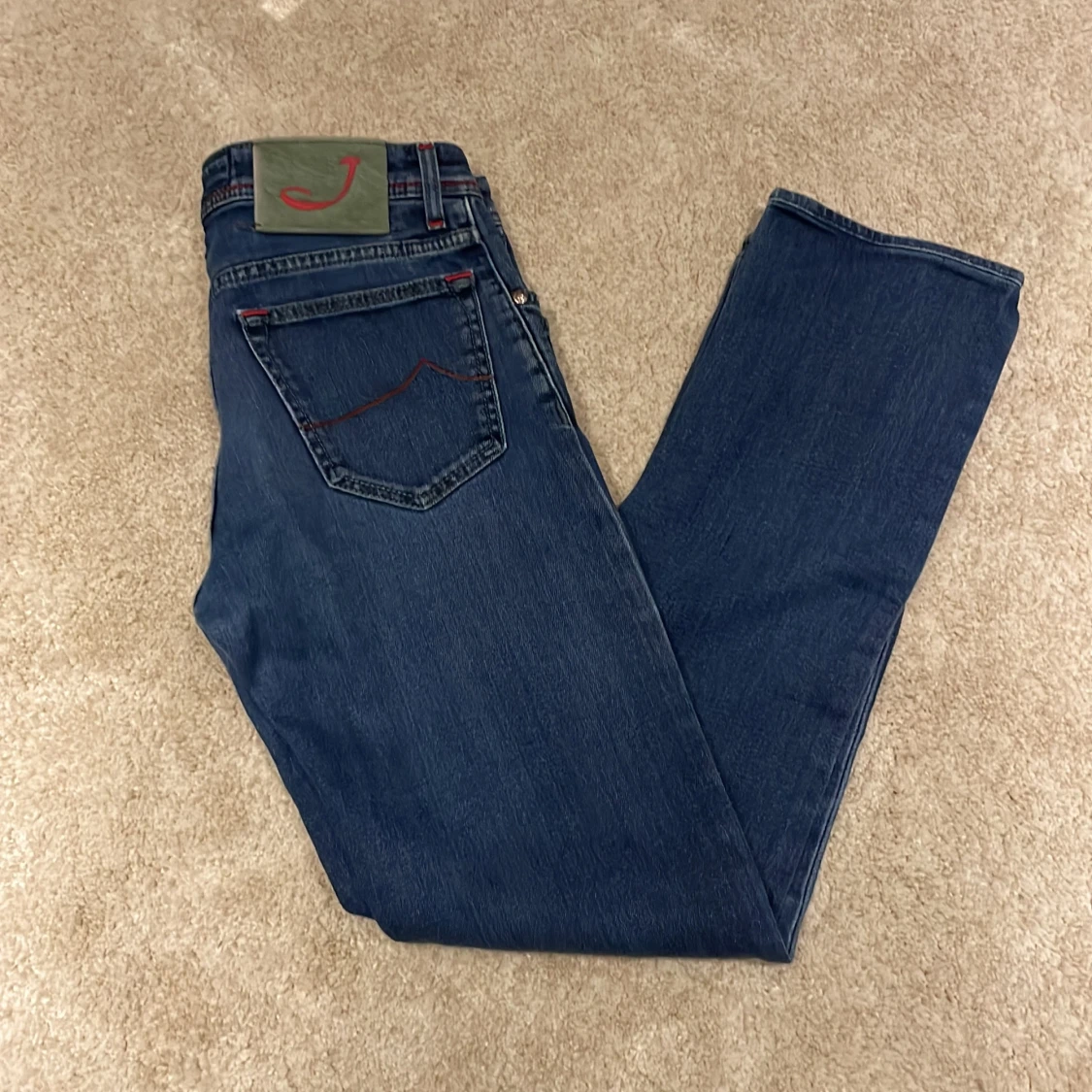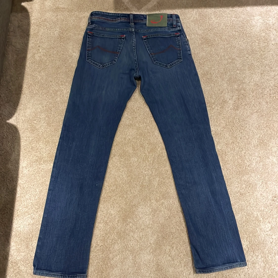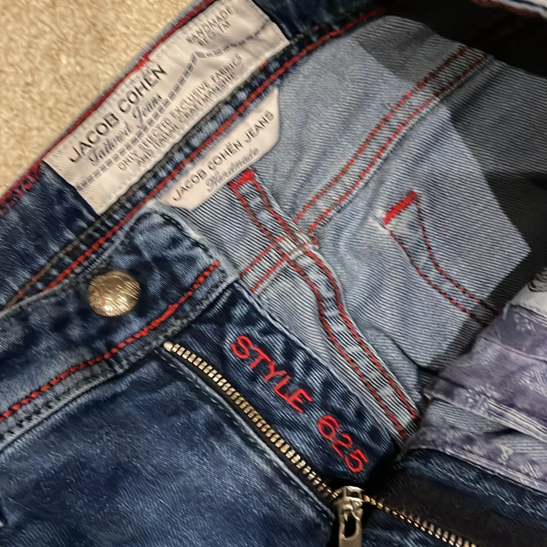 Riktigt snygga blå jeans från Jacob Cohen i modell 625. bra skick och inga defekter. De är storlek 29 men är skräddarsydda så skulle säga att de passar någon som har 29/32 i jeans storlek. Vid minsta fundering är det bara att höra av sig, priset är inte hugget i sten🤩