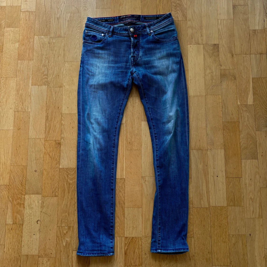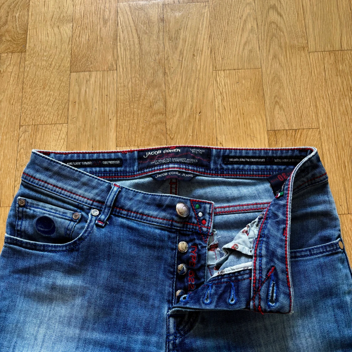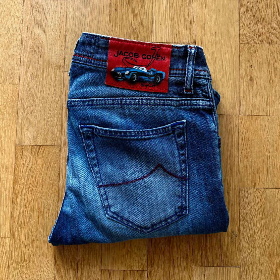 Limited editon jacob cohen jeans, endast 209 gjorda. Modellen på jeansen är 622, vilket är den snyggaste slim modellen. Jeansen har knappar med äkta silver, samt snygga röda detaljer. Byxorna är i nyskick och endast använda ett fåtal gånger, byxorna är lite upplagda hos eller skräddare. Detta är jeans nummer 83 av 209. Hör av er vid fler frågor!
