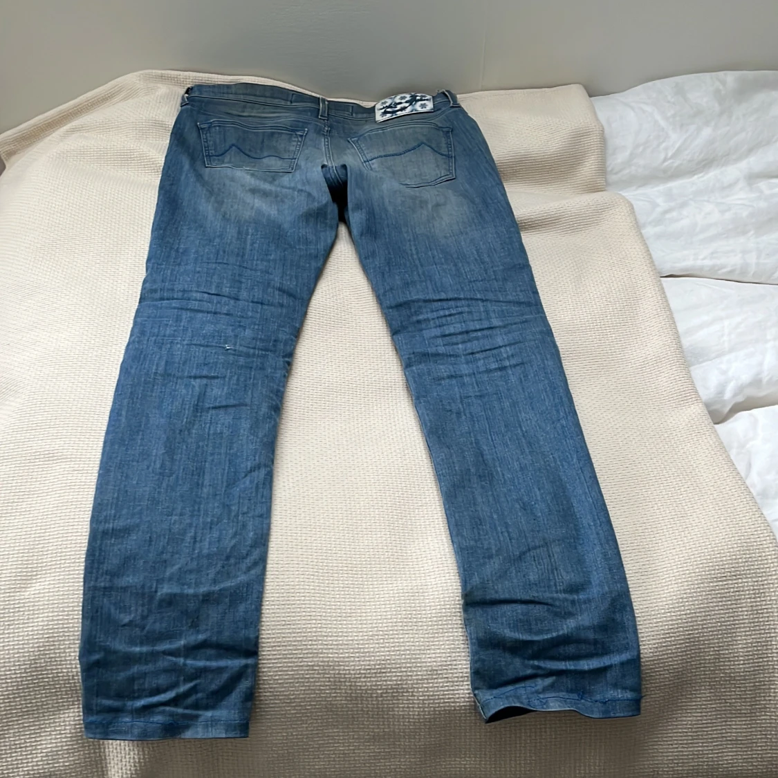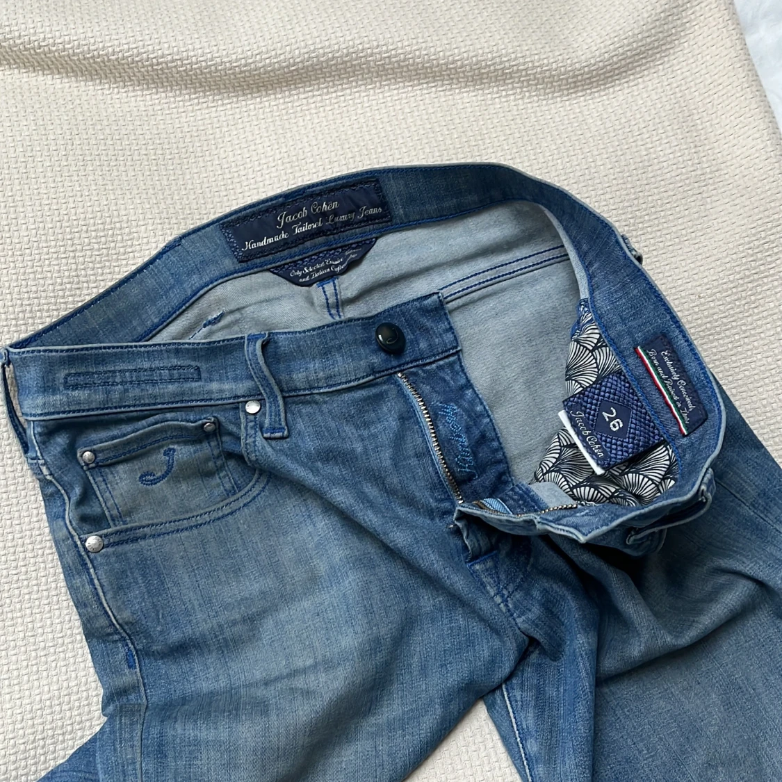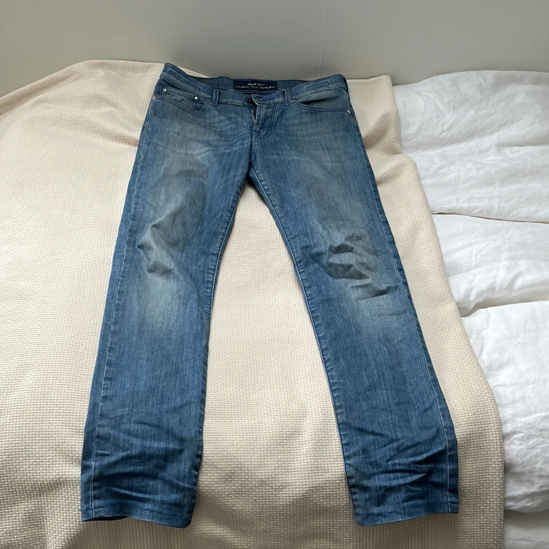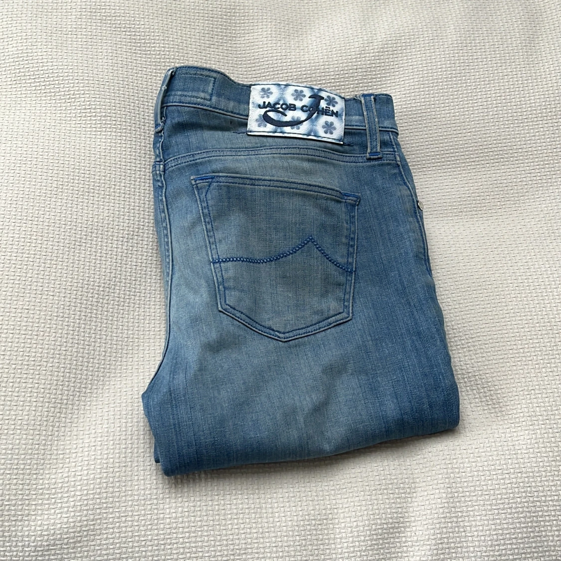 Tja! Söljer nu dessa Jacob Cohën jeans! De är ljusblåa och har många fina detaljer (se bild). Längst ner så är den sydd ihop för att den var för lång, men det ser ut som vanligt, och det märks inte. Utöver det så är skicket 10/10, inga defekter alls! Storleken är 26, så jag skulle säga att den passar om du är 155 cm - 165 cm. Perfekt för fina sommarmiddagar🥂! Tveka inte med frågor!🤝