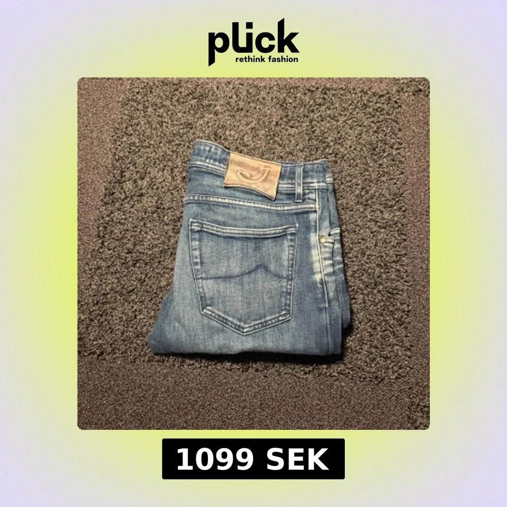 Snygga blå jeans från Jacob Cohen med klassisk femficksdesign och ljusa slitningar framtill. Storlek 34 bra skick