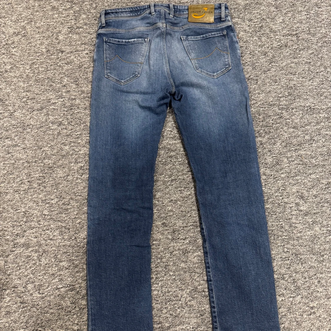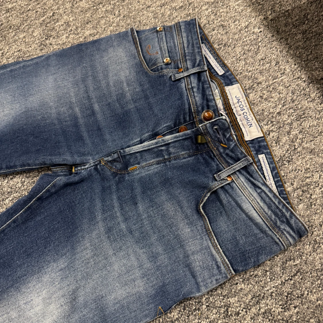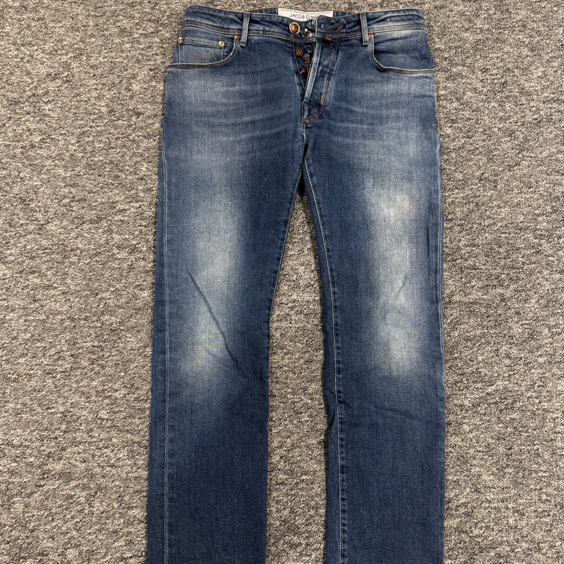 Snygga blå jeans från Jacob Cohen med klassisk femficksdesign, bruna kontrastsömmar och läderpatch bak i midjan. Jeansen har raka ben och subtila slitningar framtill för en cool, avslappnad look. Tillverkade i mjukt denimtyg med knappgylf. Style 688! Just den byxa har Krobbe burit på Guttashow, ”10 Damer vs Krobbe” se för passform! Bra skick. 1045kr + frakt! Välmött, BB🍾