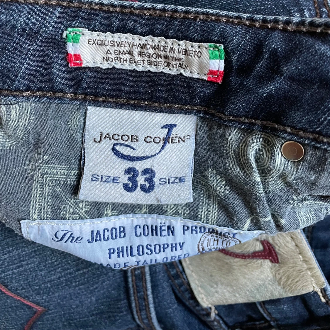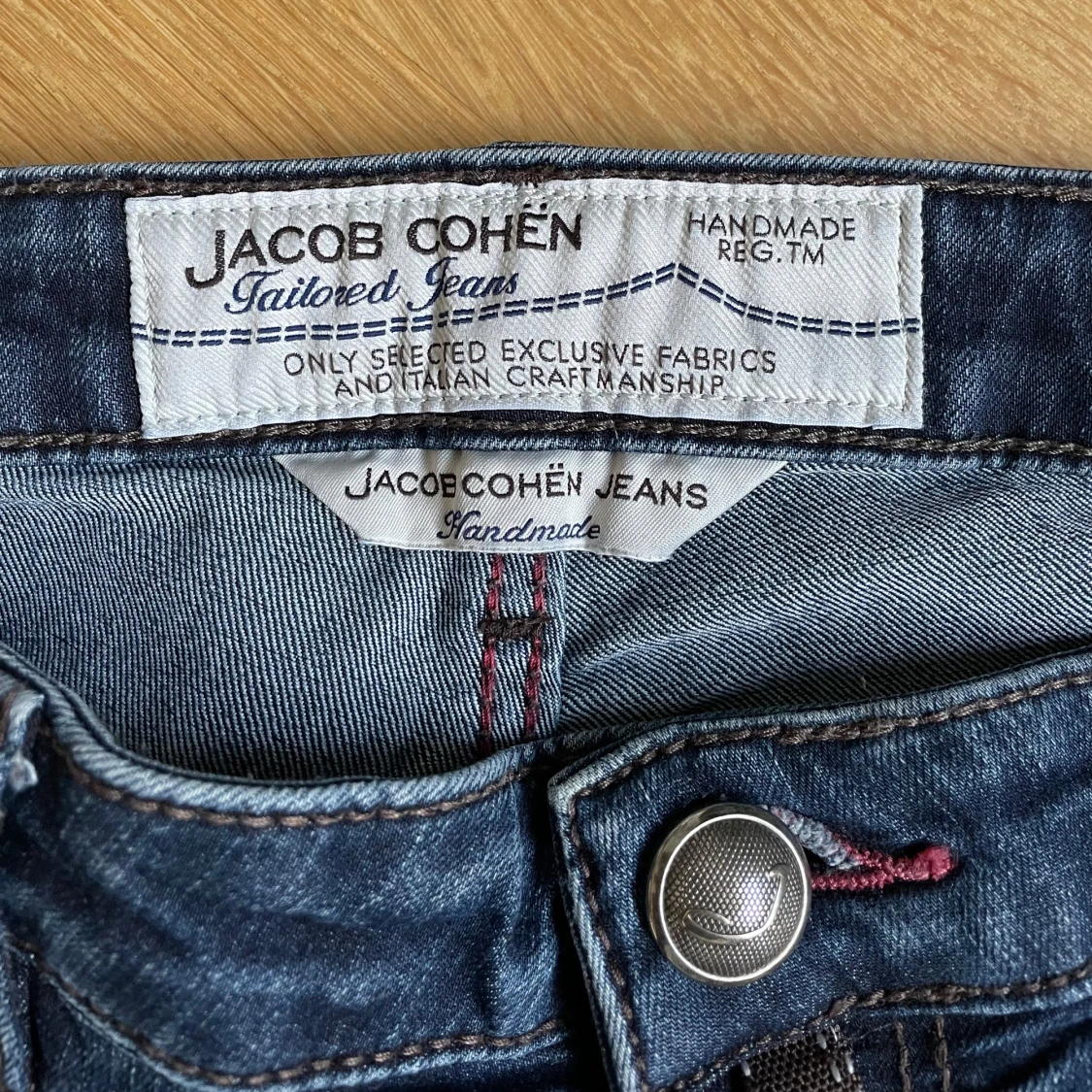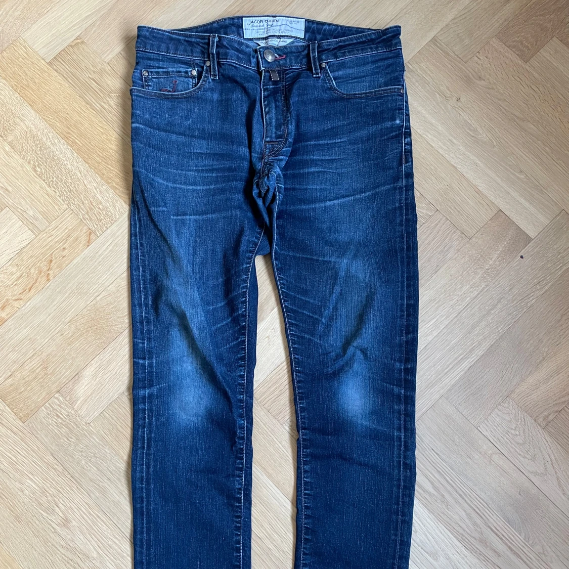 Mörkblåa slim fit Jacob cohens med fadings på fram och baksida, står stl 33, skulle säga att det känns som 32x 30. Exakta mått är: totallängd 98cm, innersöm 77cm, midja (bälteshölla-bälteshölla) 40cm