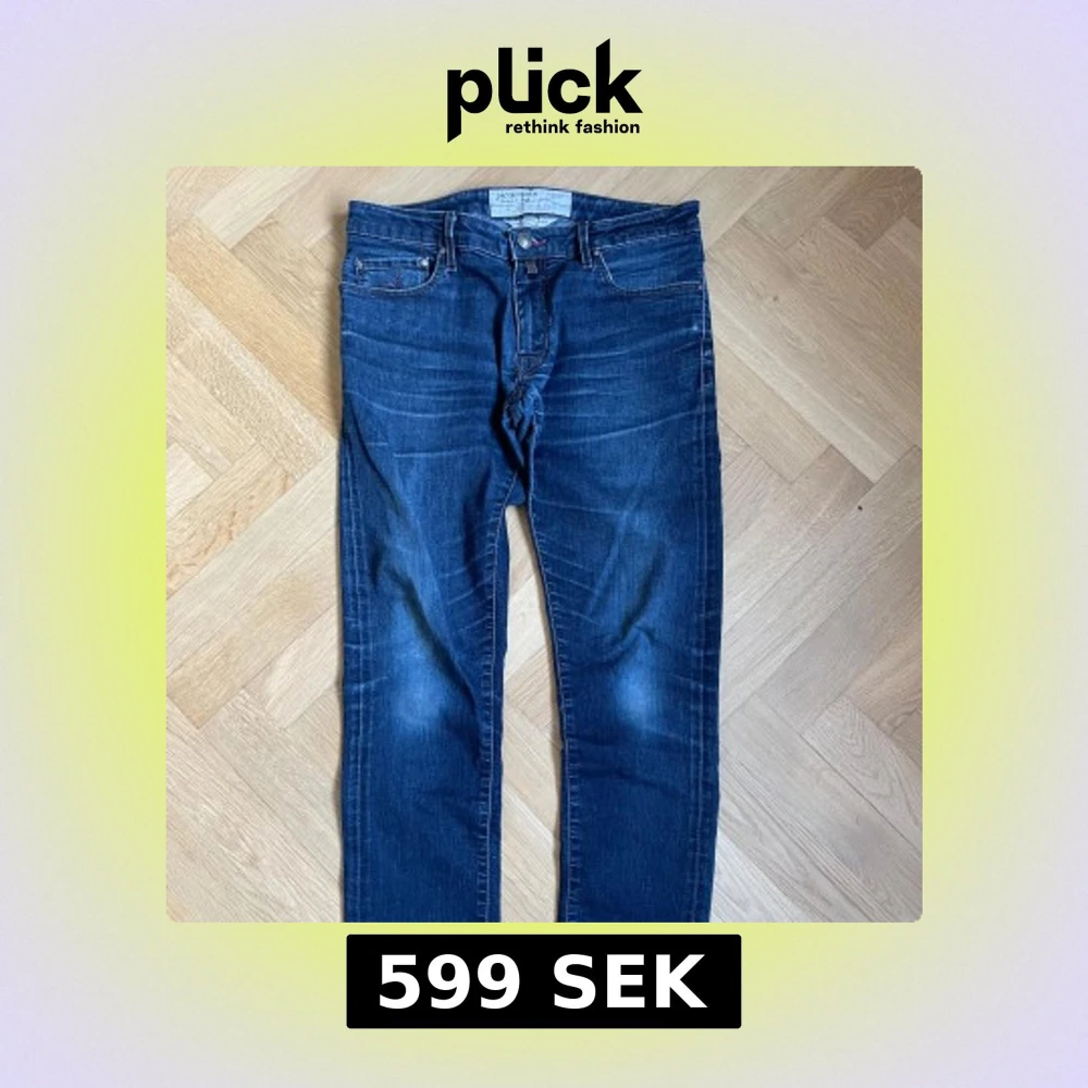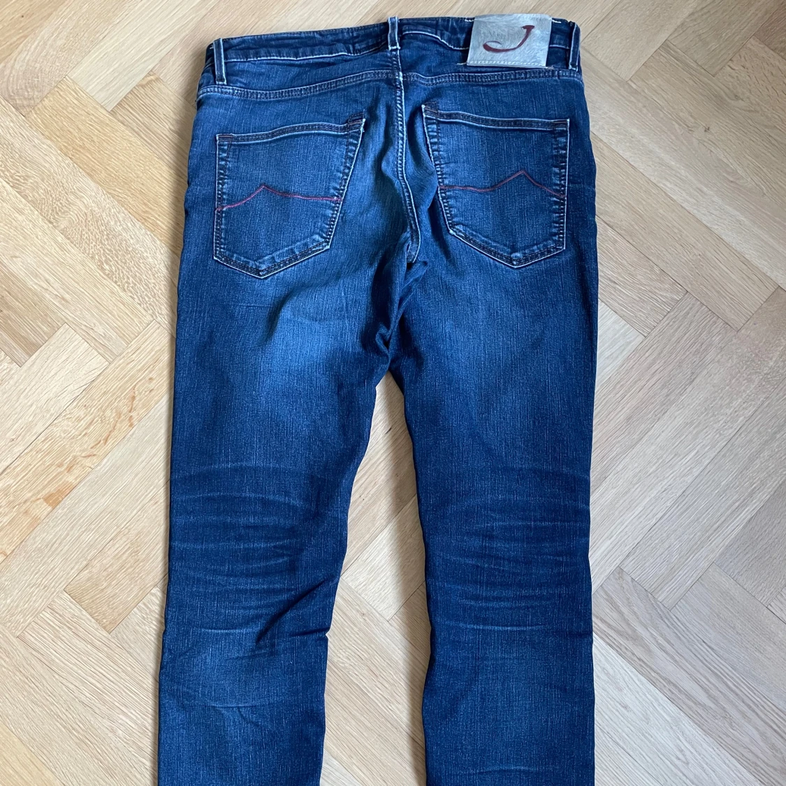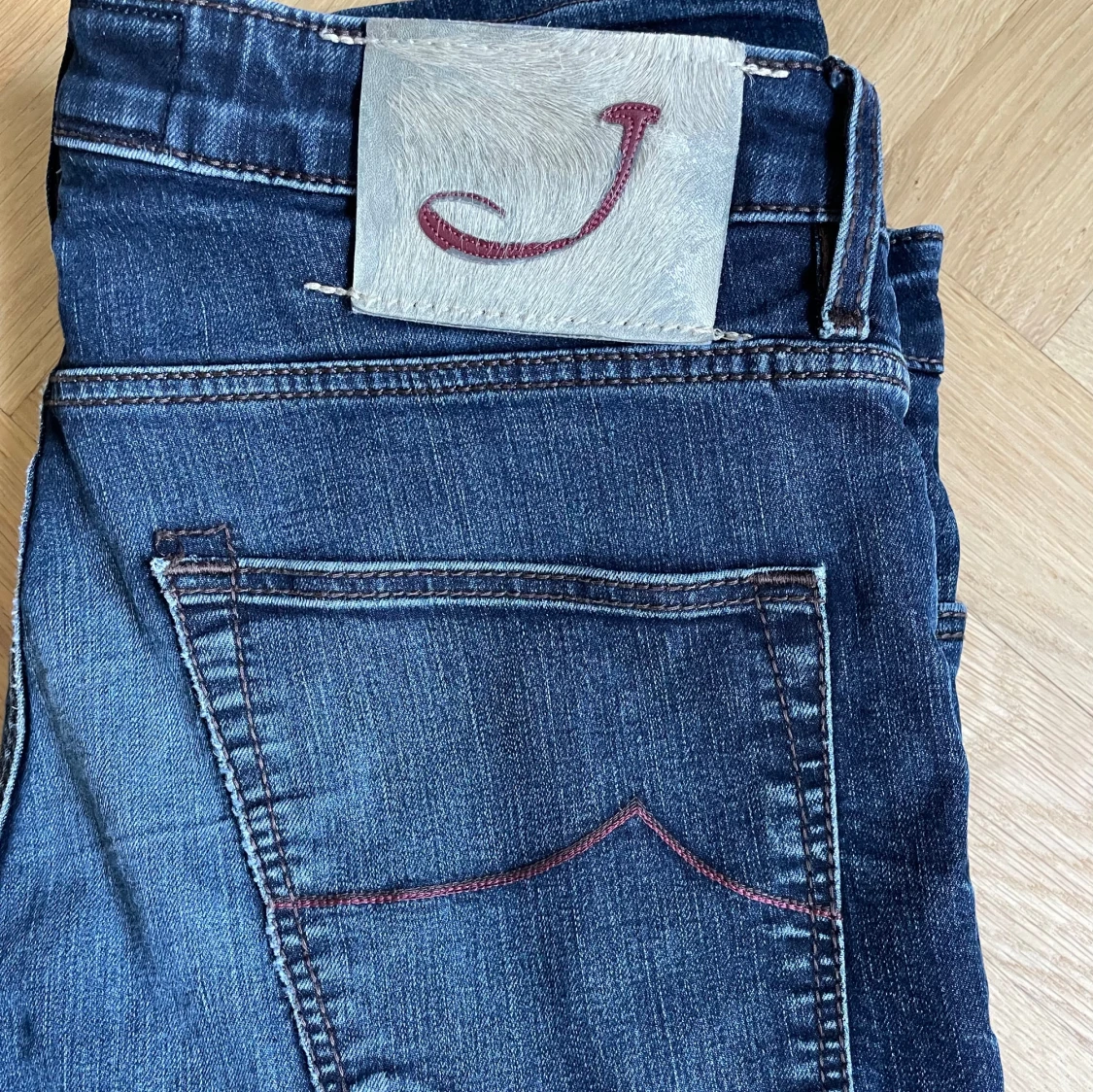 Mörkblåa slim fit Jacob cohens med fadings på fram och baksida, står stl 33, skulle säga att det känns som 32x 30. Exakta mått är: totallängd 98cm, innersöm 77cm, midja (bälteshölla-bälteshölla) 40cm