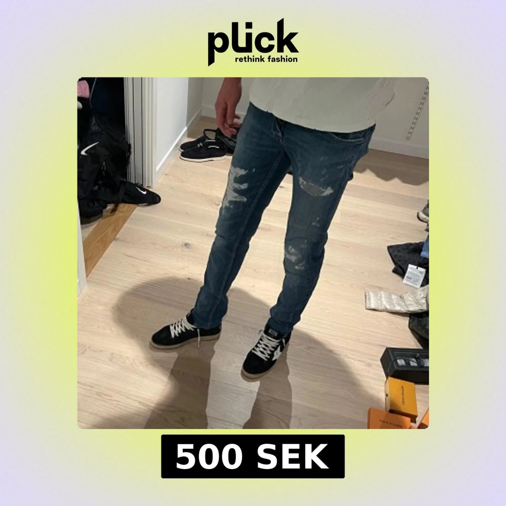 Blåa Replay jeans med slitningar Slim/stragiht fit. Jag är 187 och väger ca 65kg.