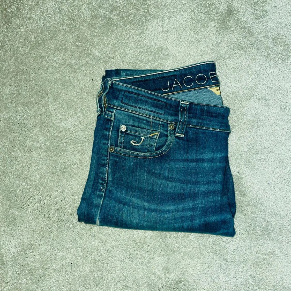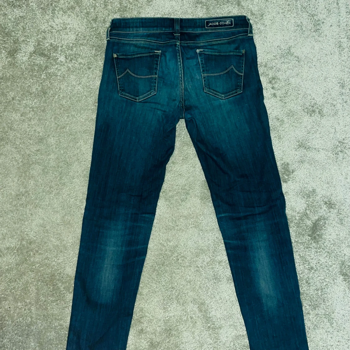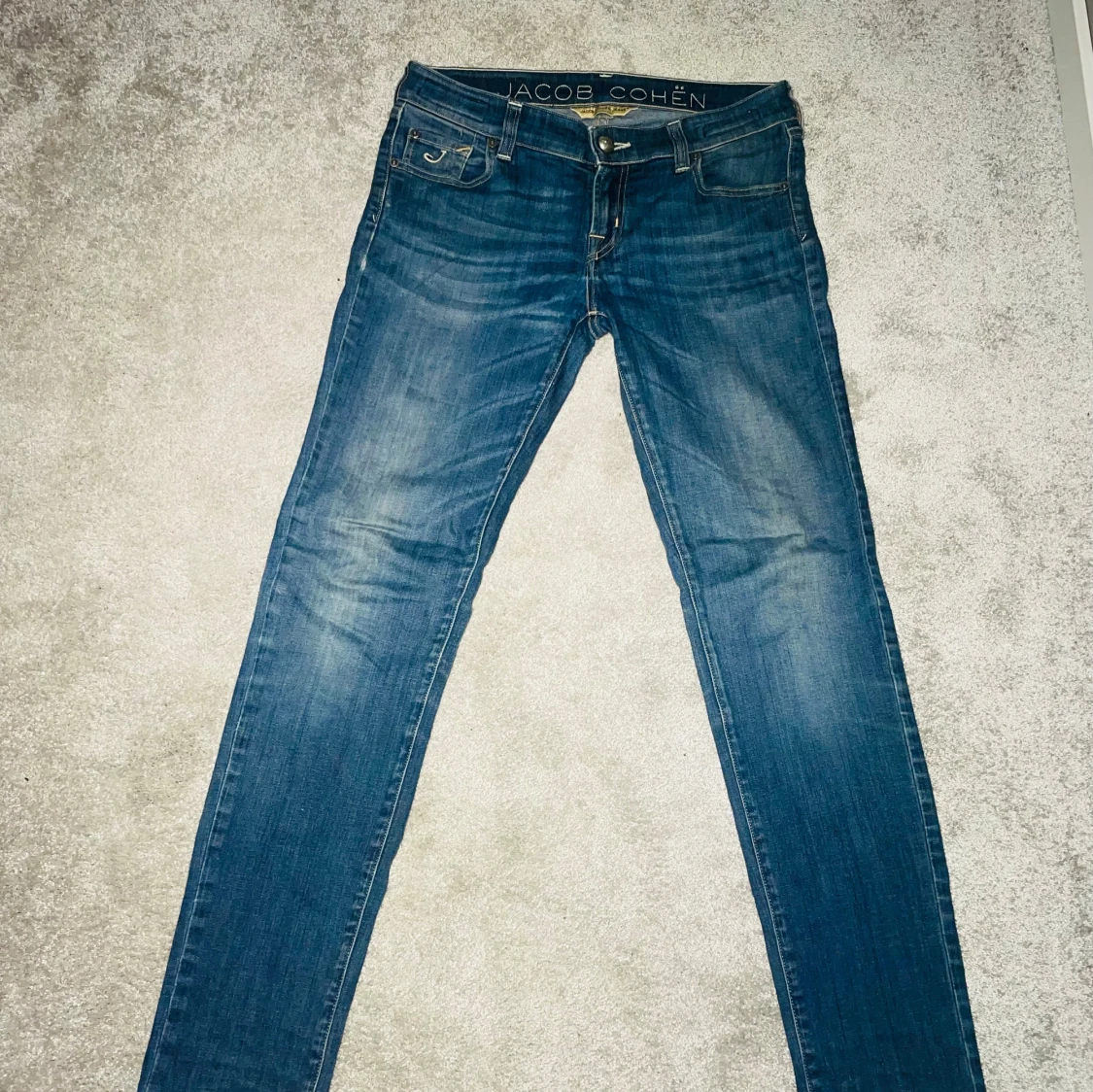 Snygga blå jeans från Jacob Cohën med klassisk femficksdesign och broderad logga på fickan. Inga tecken på slitage! Jeansen har en slim passform och är tillverkade i mjukt bomullsmaterial med lätt stretch. Besvarar frågor. Inga byten