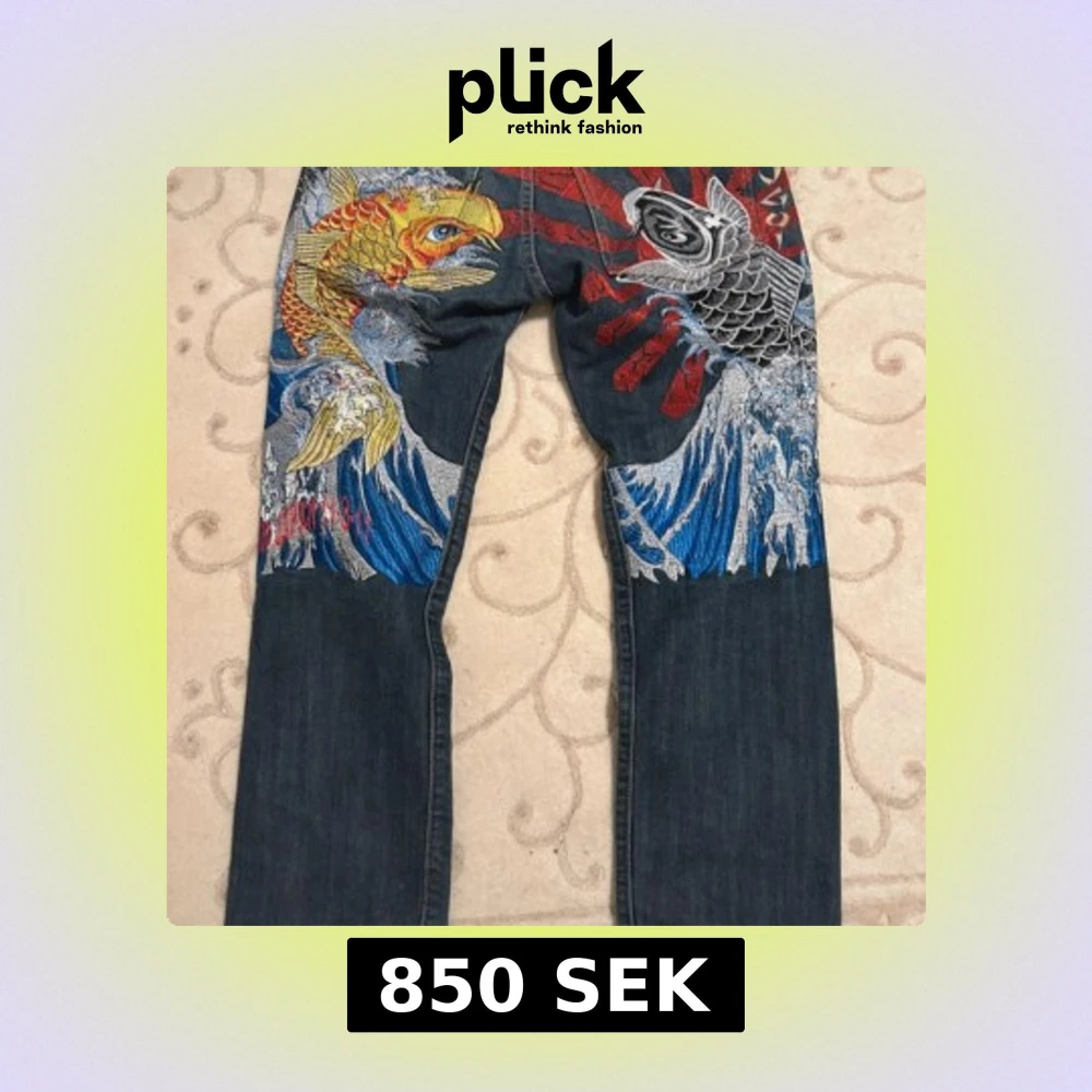 Unika jeans från Sugoi med detaljerat japanskt broderi av karpar och vågor i färgerna röd, blå och gul. Jeansen har en klassisk femficksdesign och är tillverkade i bomull. Midja 42 cm längd 100cm benöpning 20cm