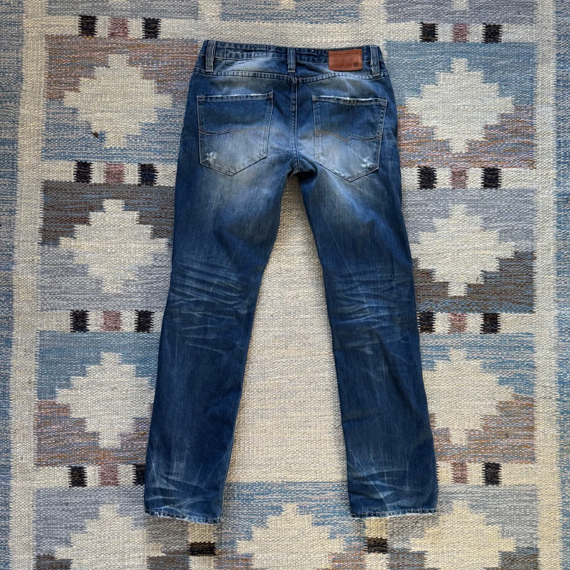 Snygga blå jack and jones jeans med en klassisk straight/slim fit. De har en lätt slitning för en cool look och femficksdesign. Perfekta för en avslappnad stil.