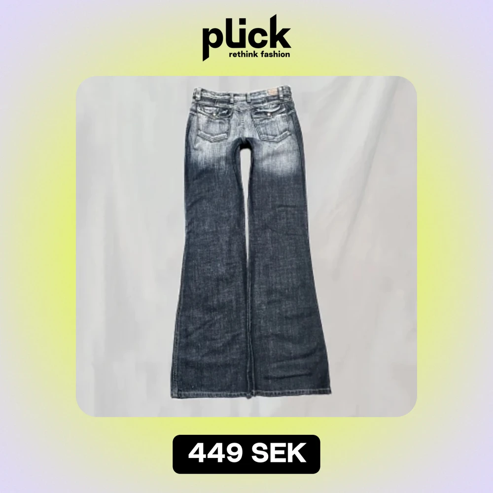 Midja: 71 innerben: 85 Jeans med vida ben och detaljerade bakfickor. Storlek w27 men skulle tro att de är lite mindre i storlek vad gäller midjan(använd mått). Skulle säga midwaist. Eventuellt ytterst smått nötta men överlag så gott som nyskick!🤍