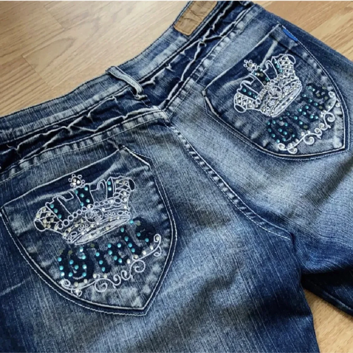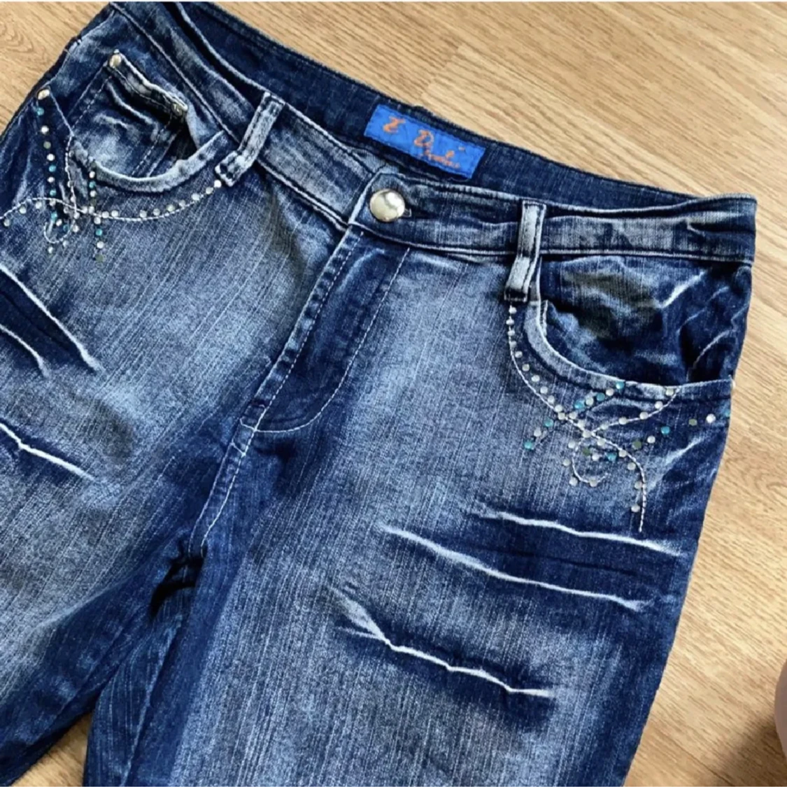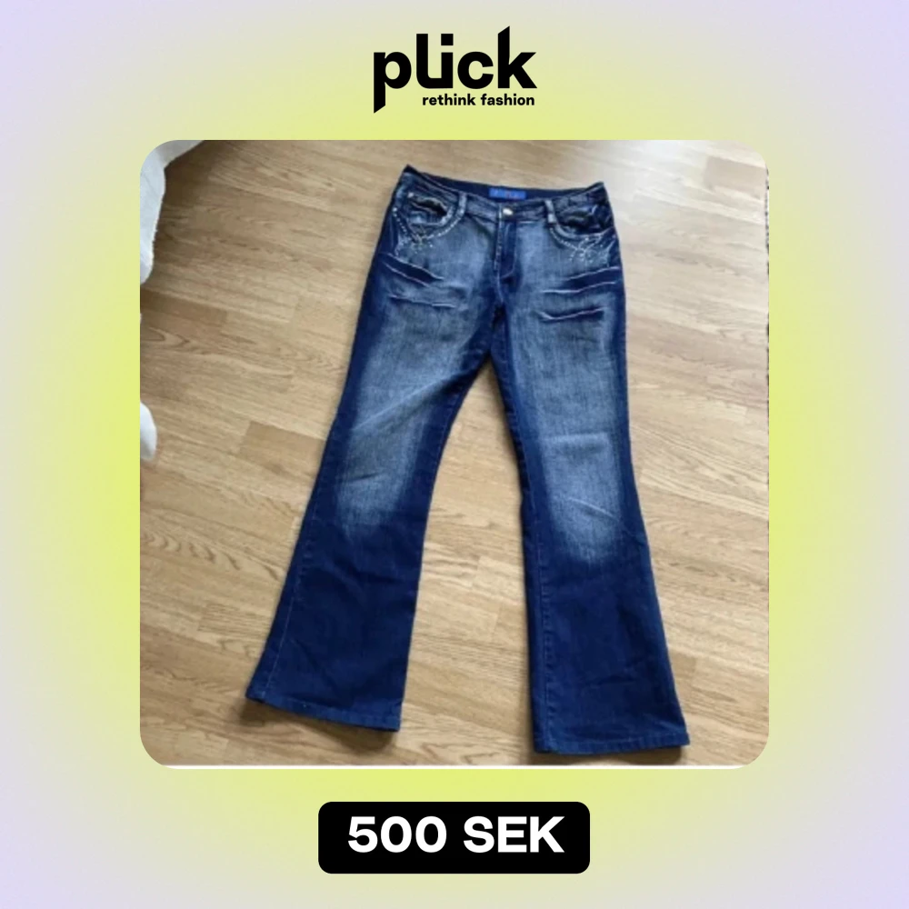Super snygga jeans med rhinestones, midjemåttet rakt över är ca 39cm och innerbenslängden 85cm. Hälen är lite upptrampad då de är lite långa på mig som är 167, annars inga defekter förutom att ett fåtal stenar åkt av.