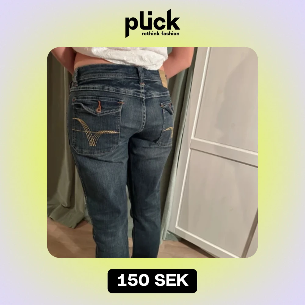 Lågmidjade mörkblå jeans med detaljer och design. Jeansen är raka i modellen.