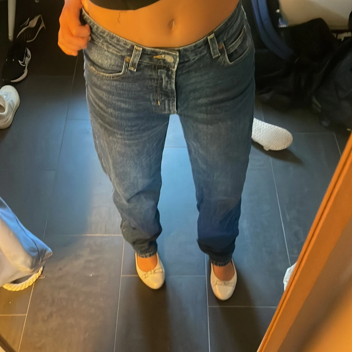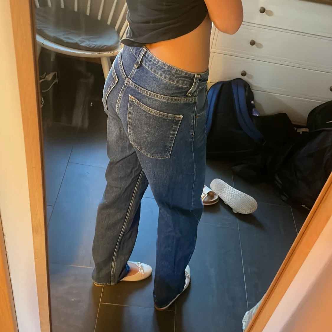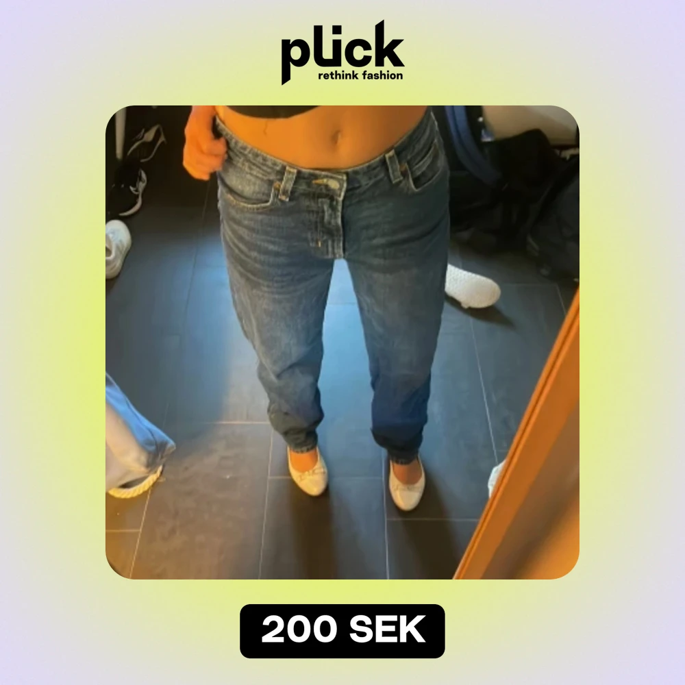 jätte fina jeans i mörkblått❤️ är ca 170, står inte storlek men skulle säga S/36