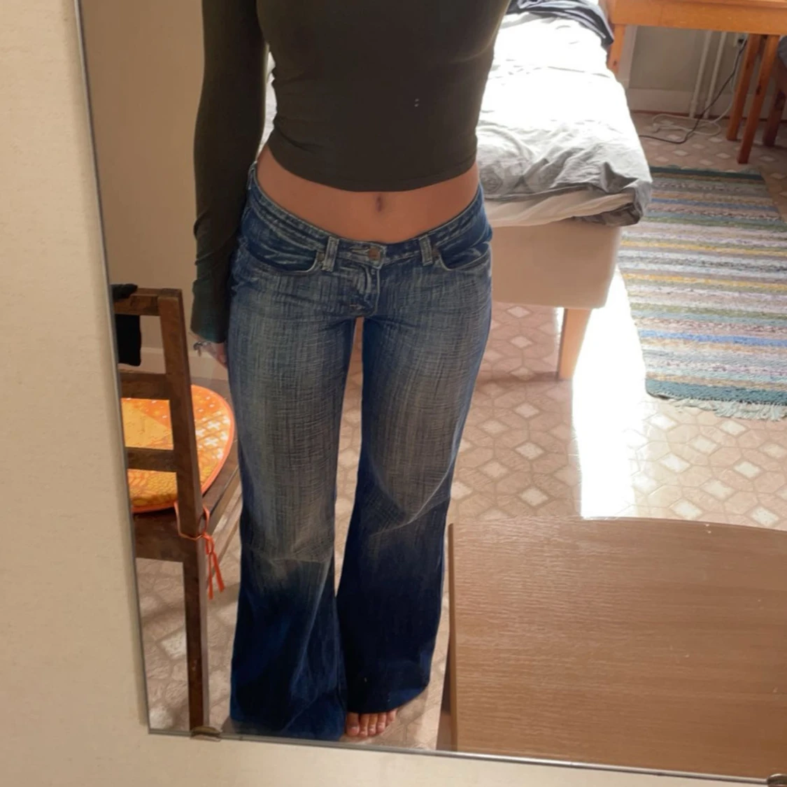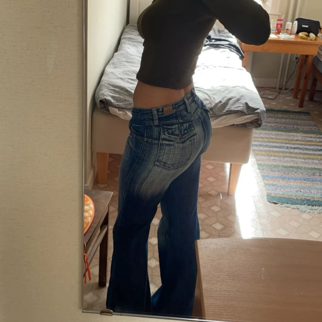 Vintage low waist jeans, midjemått 36 innerbenslängd 82! Slitningar ner till, kan skicka bild privat om så önskas!
