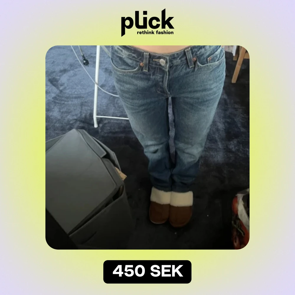 Mörkblå jeans från Weekday. Aldrig använda. Storlek 26/34 men uppsydda till 26/28 i längd istället.