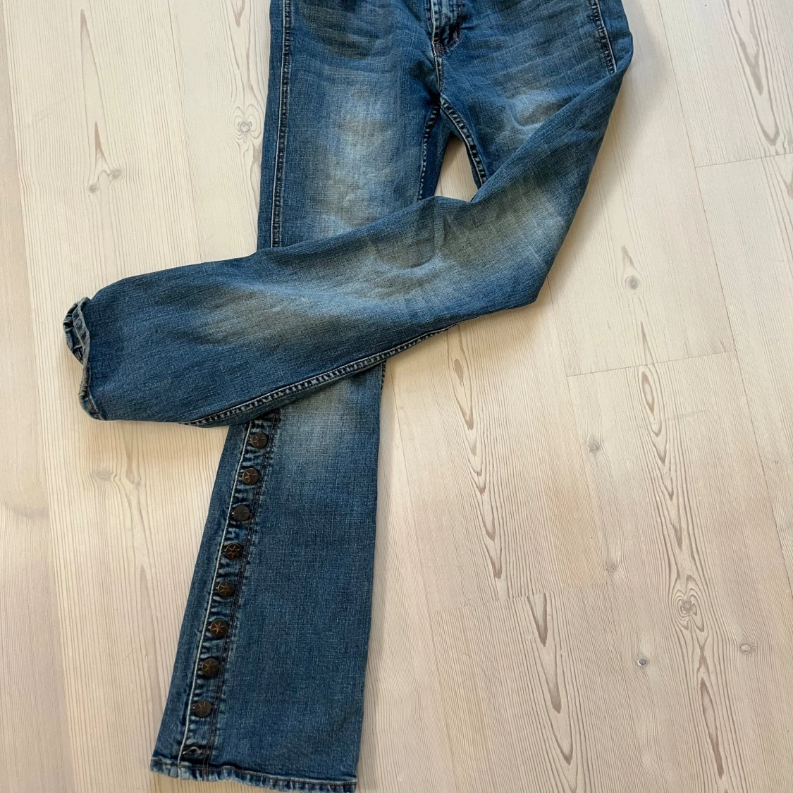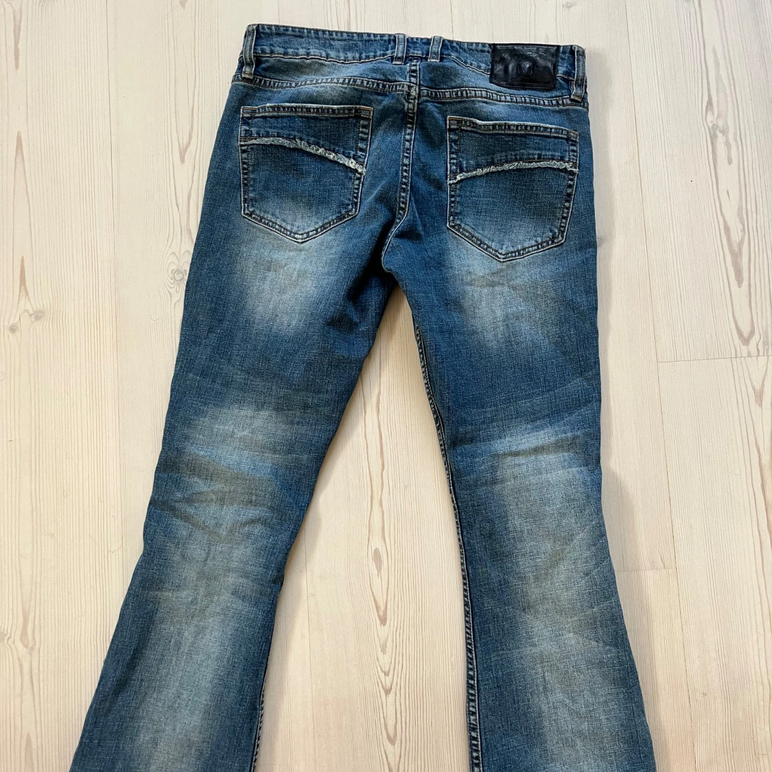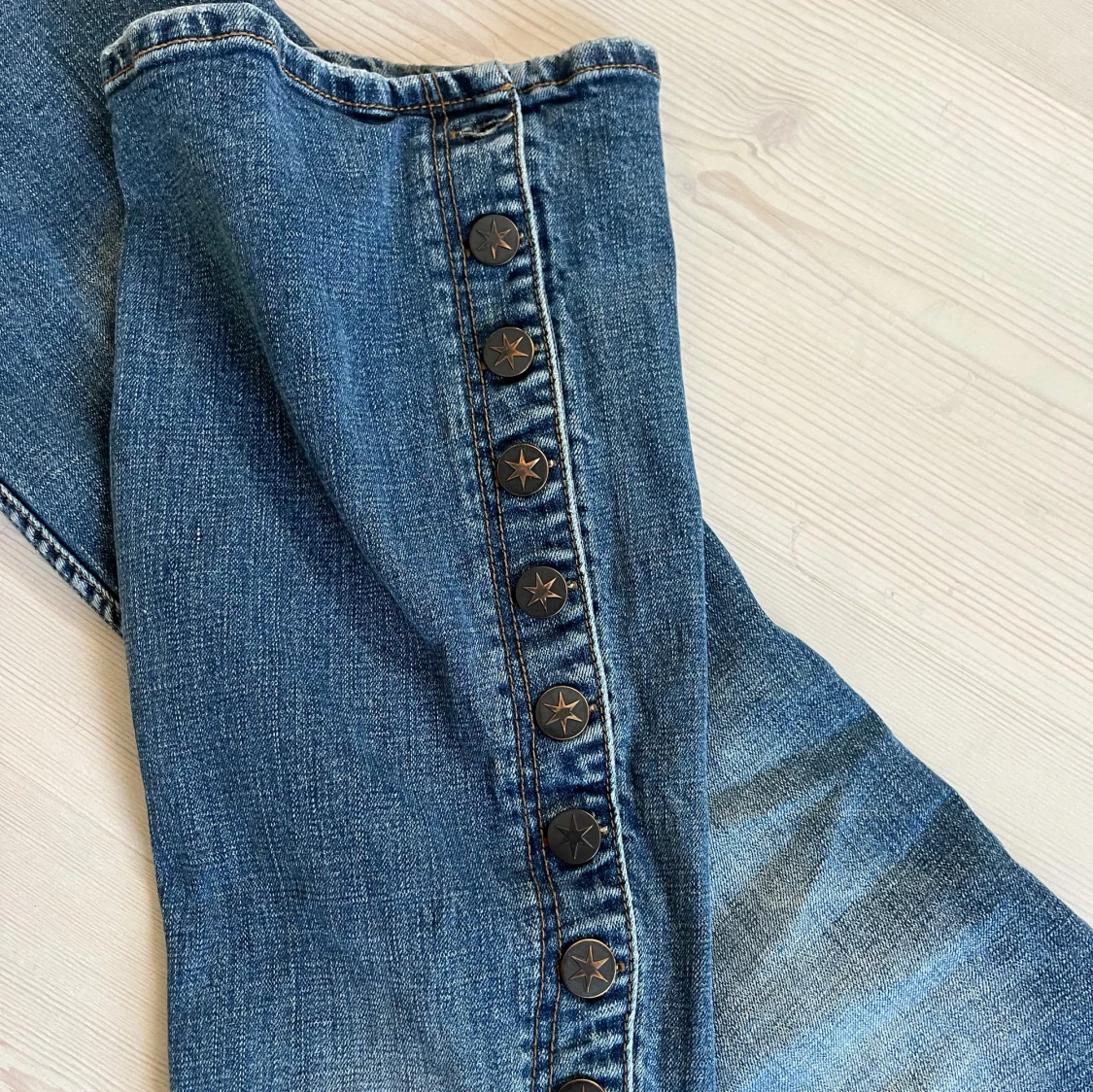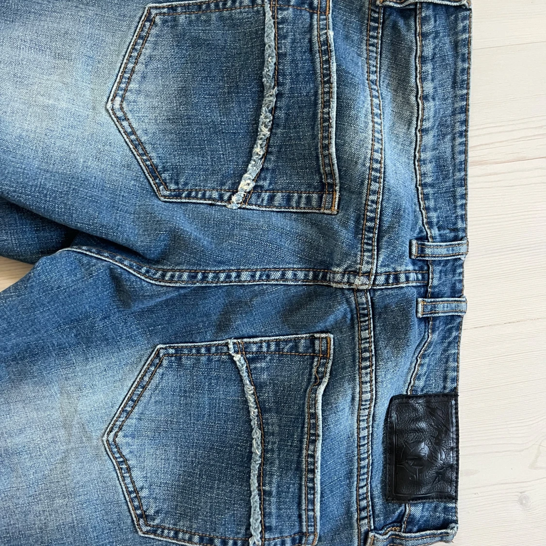 Jag är 168 cm och dem passar perfekt i längden för mig. Lågmidjade och använda några få gånger bara. Inga defekter förutom att fickorna på framsidan är lite sönder (men det är inget som syns på utsidan😊storlek 32 men passar på mig som är S/M.