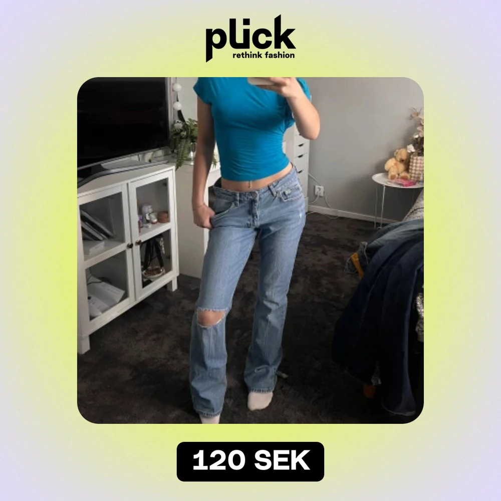 Blå bootcut jeans med slitningar - Säljer ett par ljusblå lågmidjade bootcut jeans från Gina Tricot med snygga slitningar över knäna och klassiska fem fickor. En julklapp som tyvärr inte passade💕