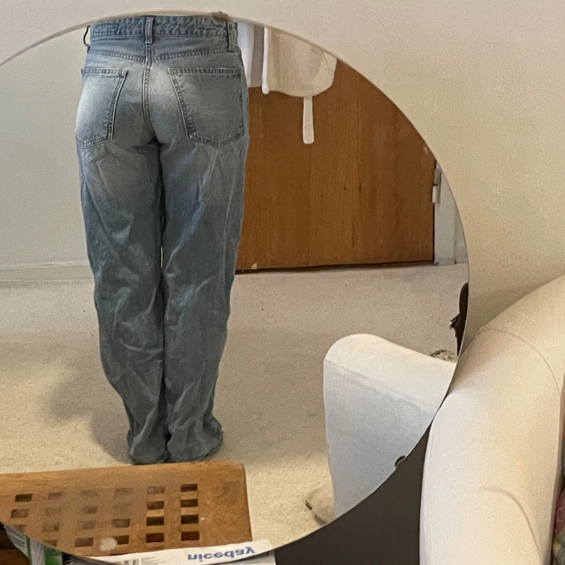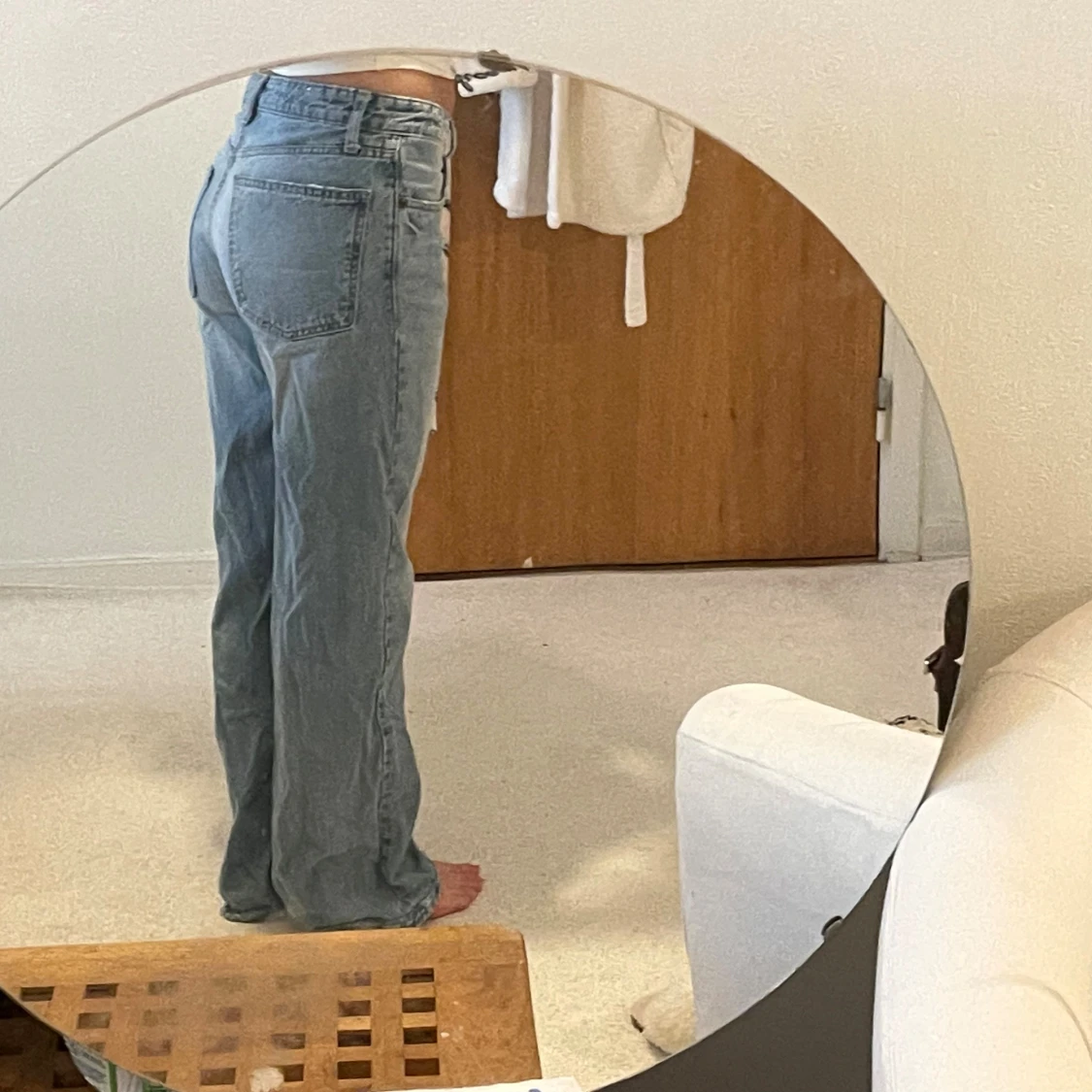 Säljer ett par ljusblå jeans med klassisk femficksdesign och raka ben. Jeansen har normal passform och är tillverkade i mjukt denimtyg. Lite skrynkliga på bilden!❤️