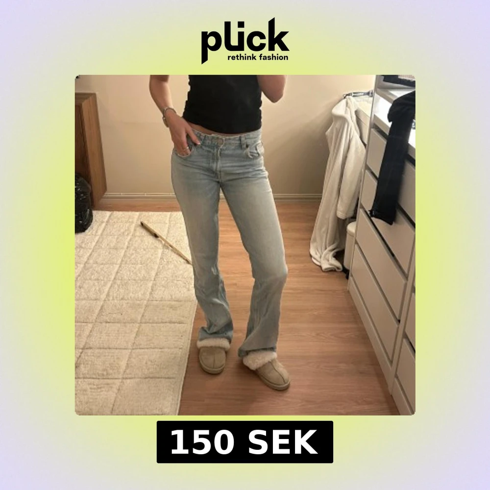 Ljusblåa jeans från zara. Strl 34. Jättebra skick förutom att en bältesgrej har halft lossnat och slitningar vid hälarna. Midrise och flare.