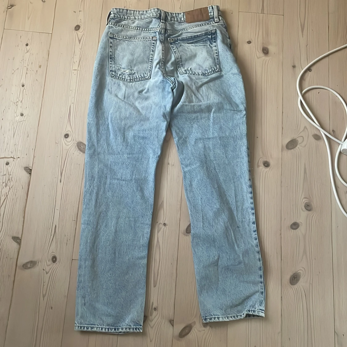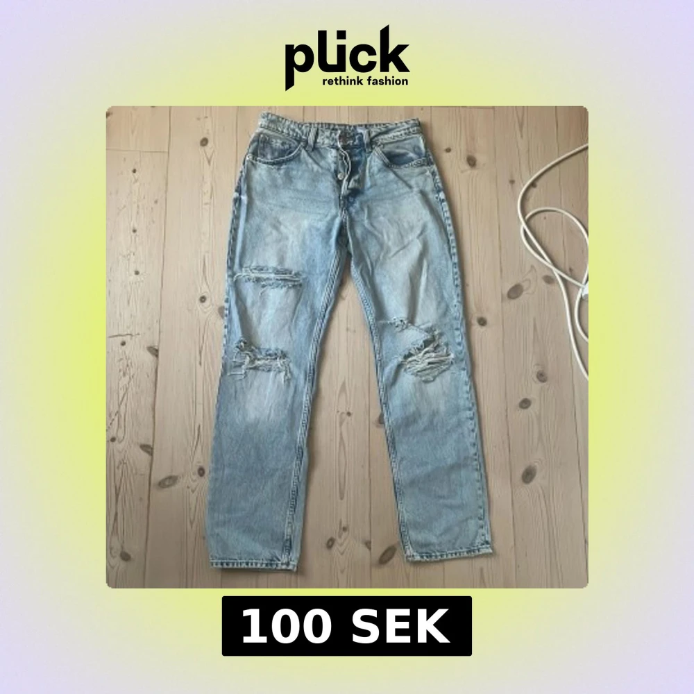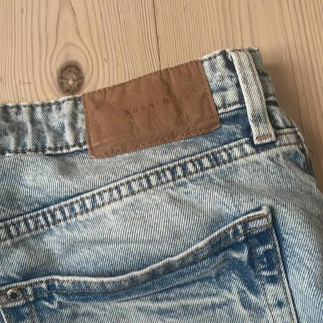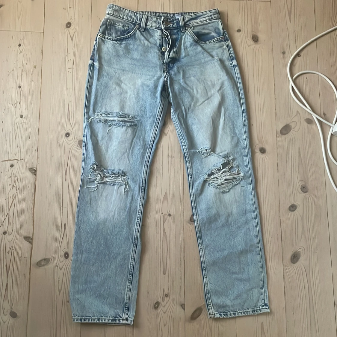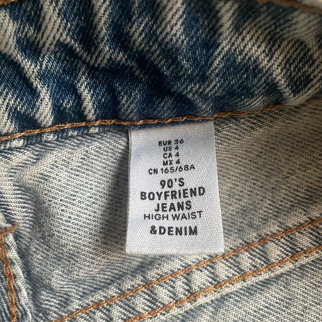 H&M 90s boyfriend jeans med hög midja. Strl 36 och bra passform, upplevs heller inte så höga i midjan ner mod inte hög. Ljus blå tvätt på byxerna och knappt använda och väldigt bra skick.