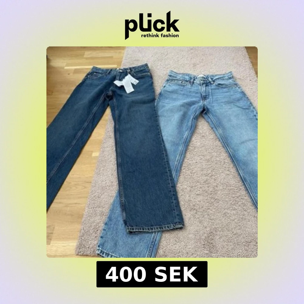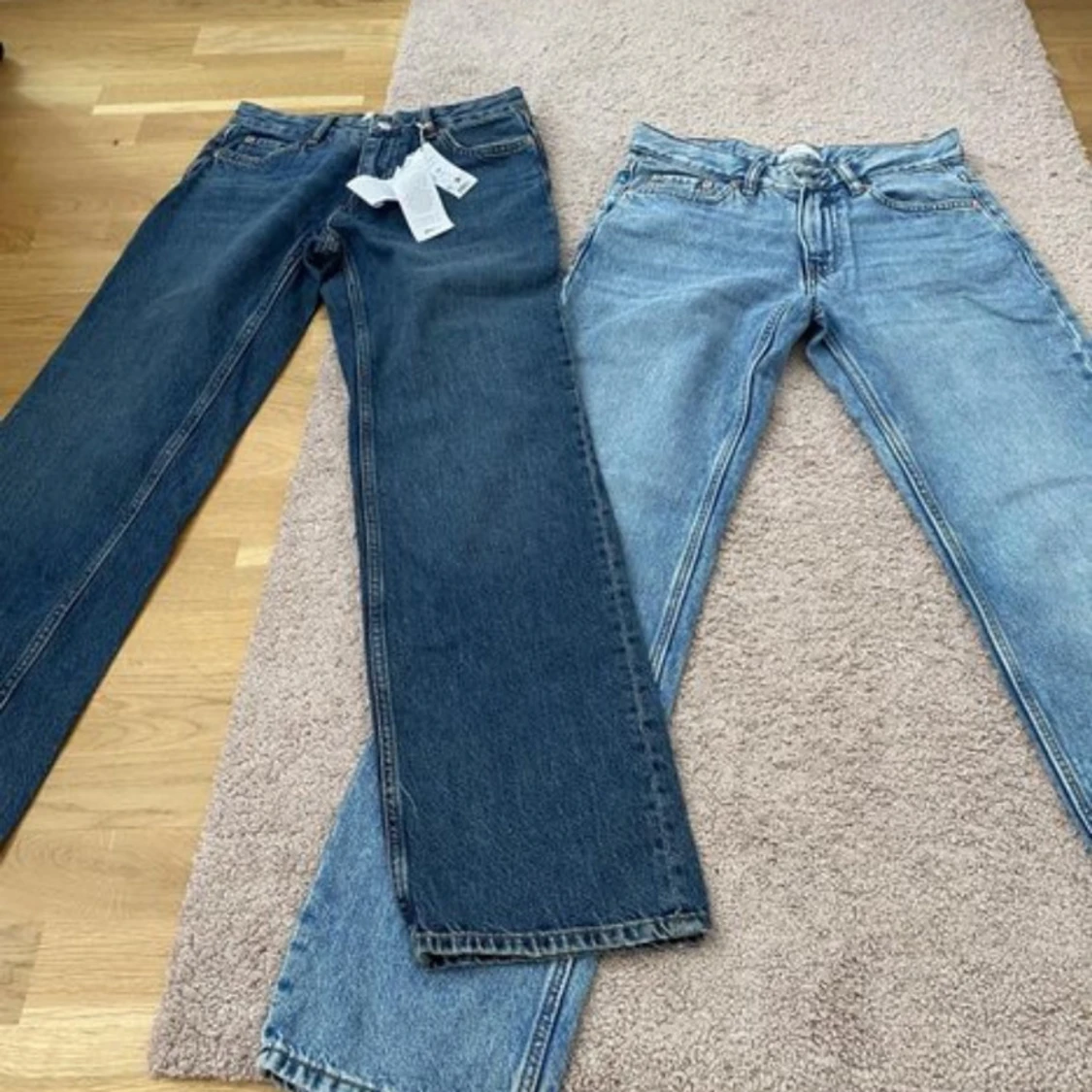 Säljer två par raka jeans, ett i mörkblå tvätt och ett i ljusblå tvätt. Båda har klassisk femficksdesign och normal passform. Perfekta för dig som gillar tidlös denimstil. 400 styck eller båda för 650 kr