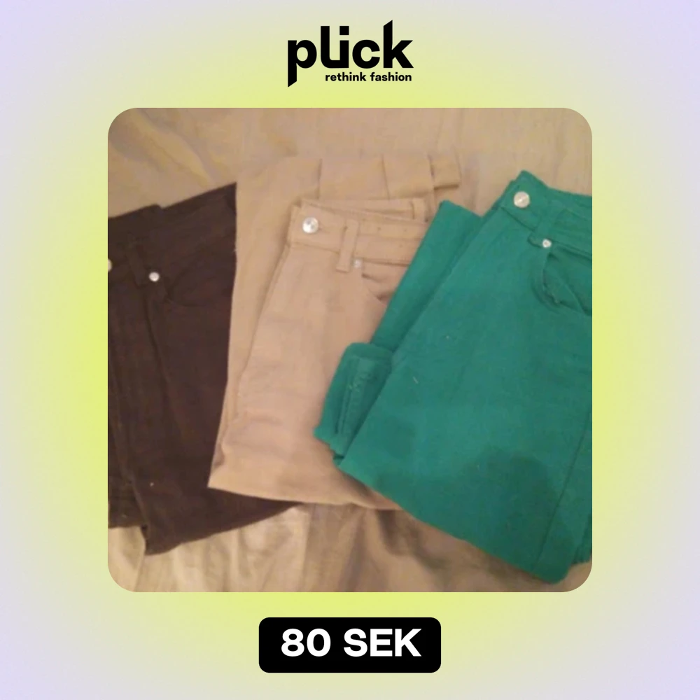 Jätte snygga jeans i brun, beige och grön❤️jag Älskar hur dom sitter på men efter som att dom är högmidjade så skaver det på min navelpercing😕dom bruna är helt oanvända och det gröna och beige är andvända 3-5 gånger skriv för bilder eller frågor❤️❤️