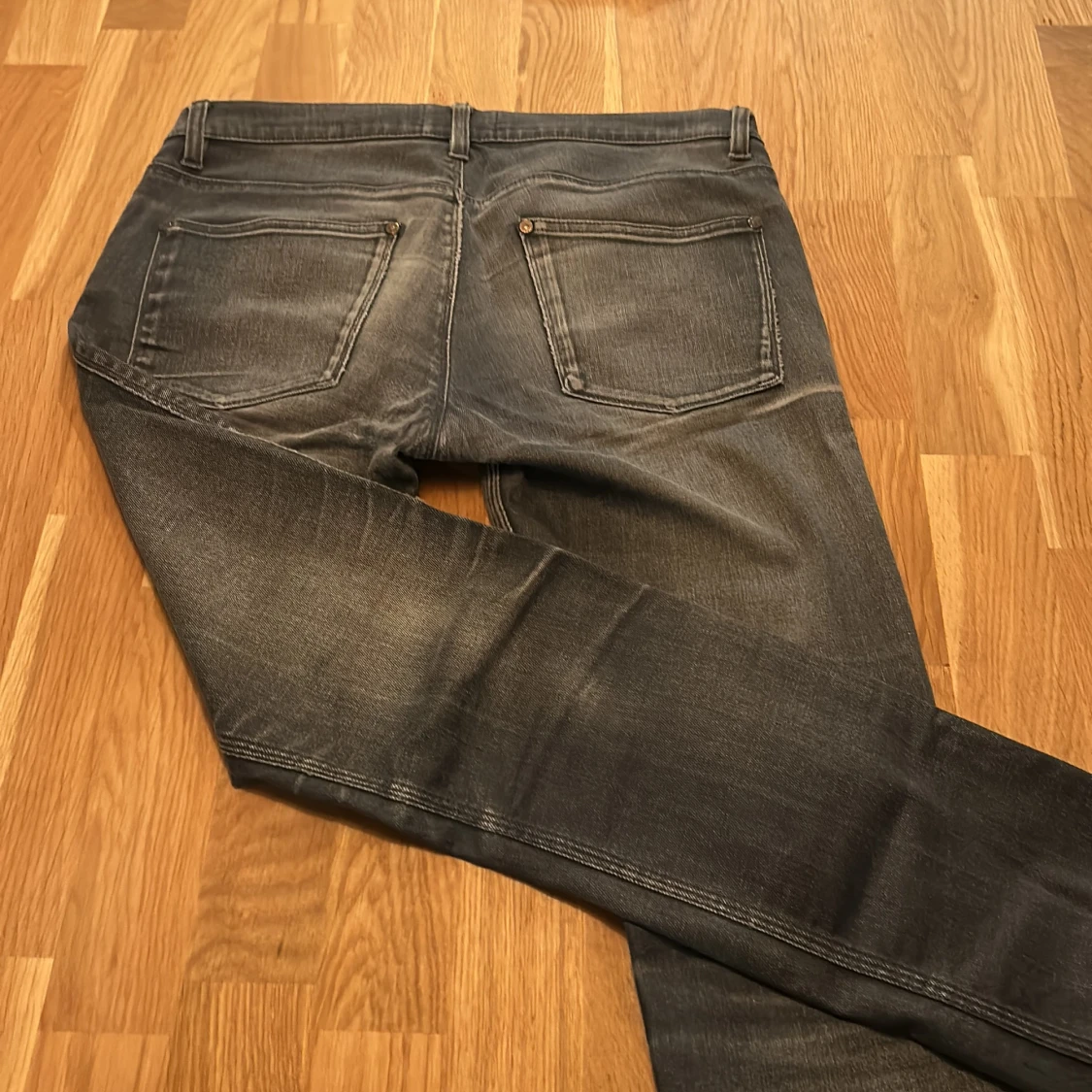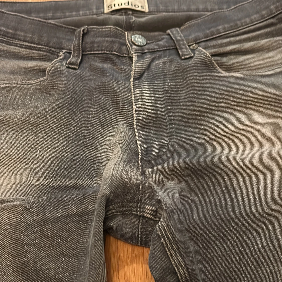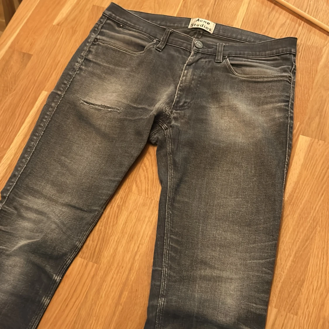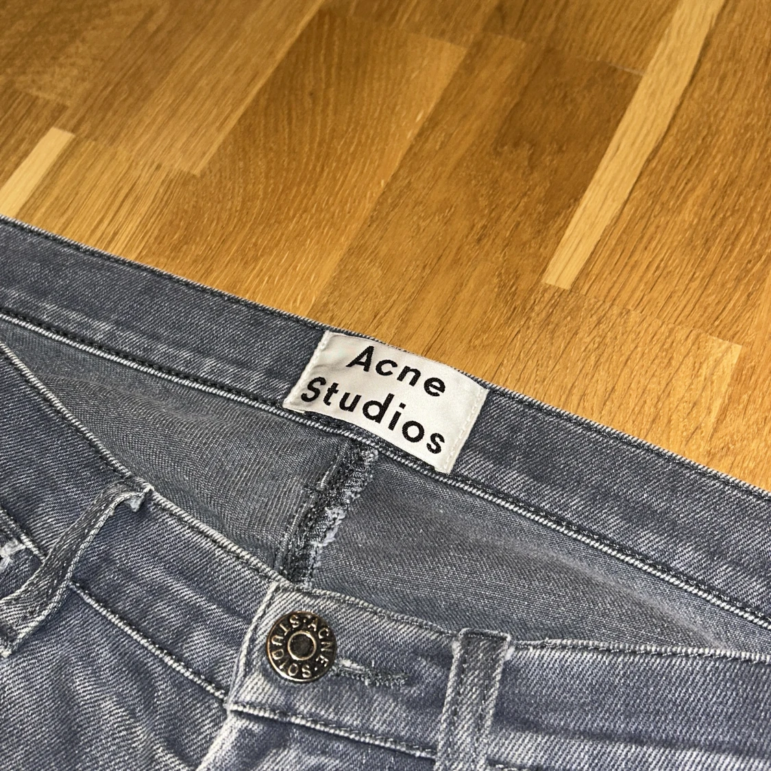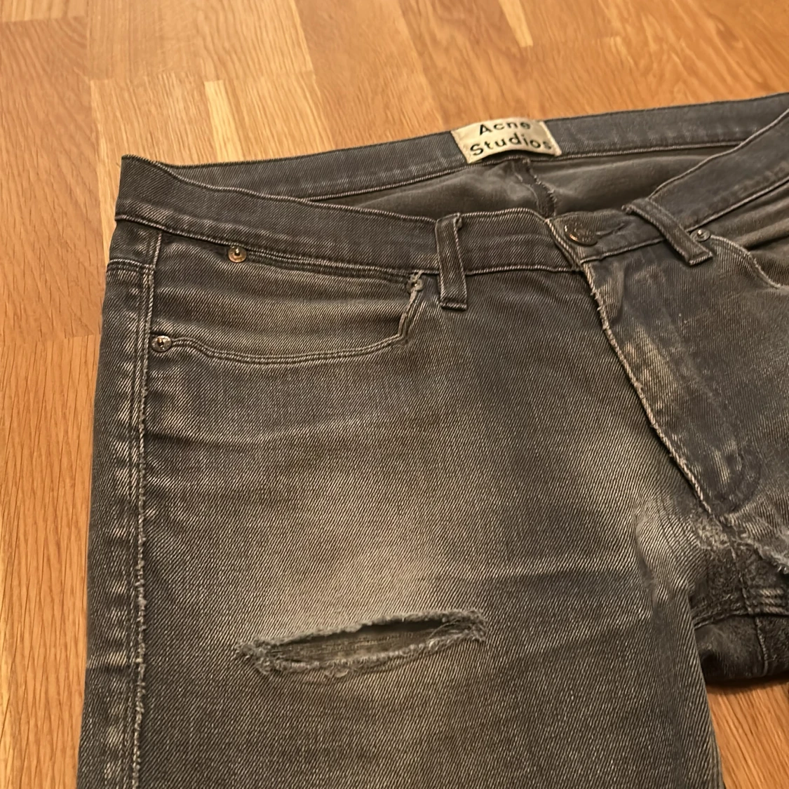 grå jeans från Acne Studios med slitningar med en riktigt snygg tvätt. Klassisk femficksmodell med skinny passform. Riktigt bra skick och köpta i stockholm för ett par år sedan. Tajta runt benen