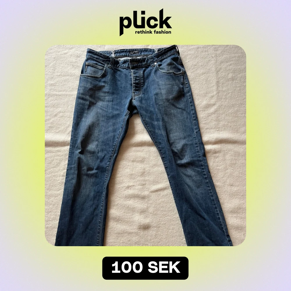 Säljer ett par snygga blå jeans från Armani i comfort fit. De har en klassisk femficksdesign och är stilrena.