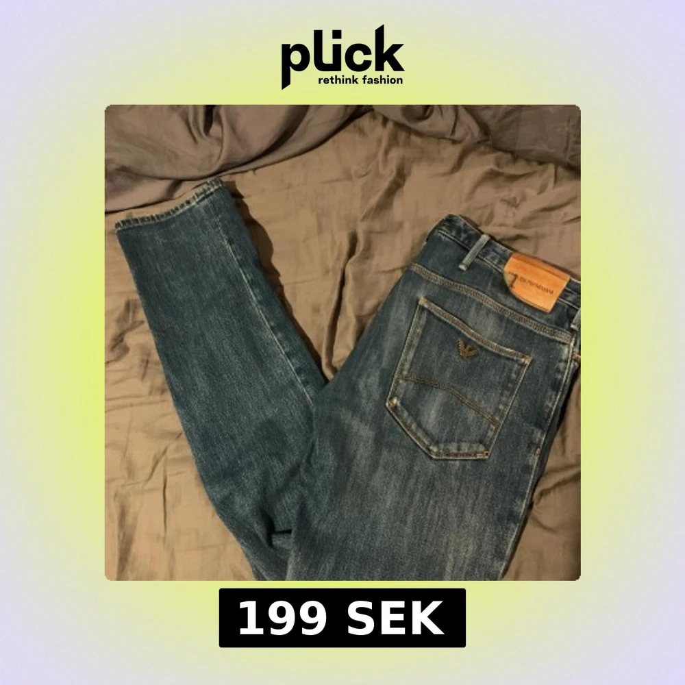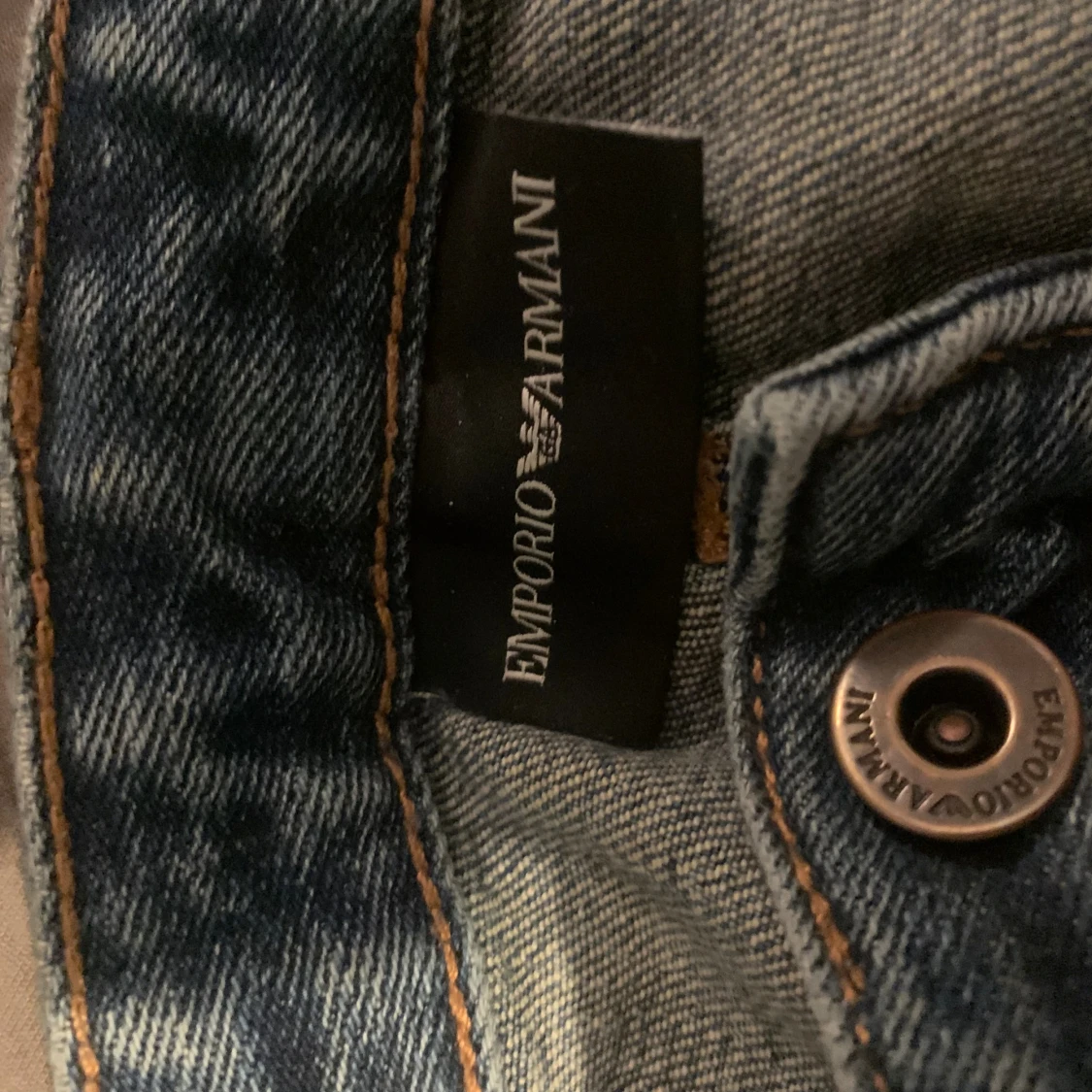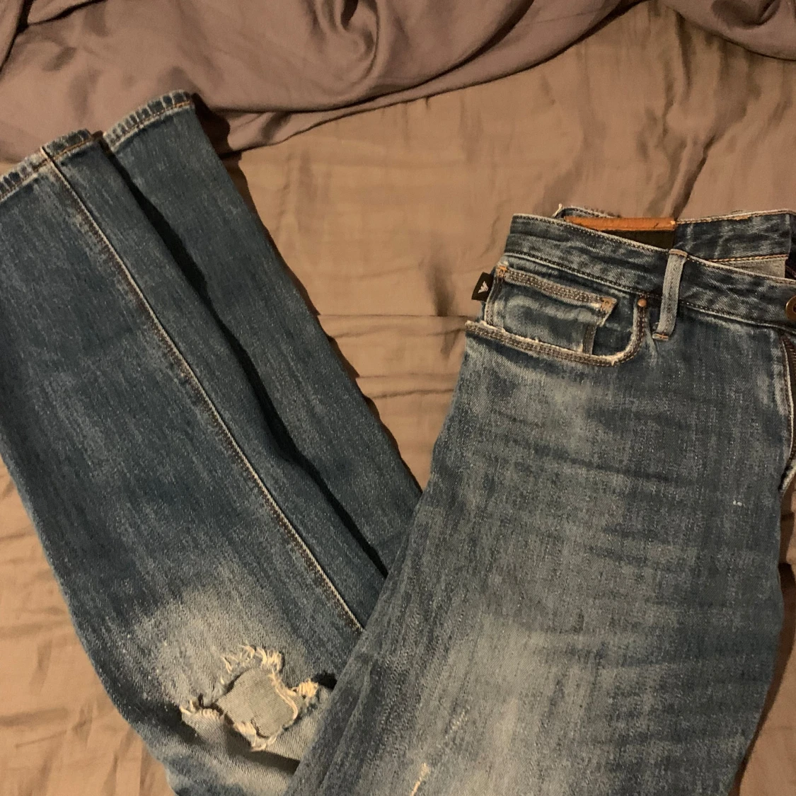 Snygga blå jeans från Emporio Armani med klassisk femficksdesign och logga på bakfickan. Jeansen är tillverkade i slitstarkt denim med coola slitningar och en liten reva på ena benet. Perfekt för dig som gillar stilrena och trendiga jeans. ena fickan är hål i andra är sydd därav priset